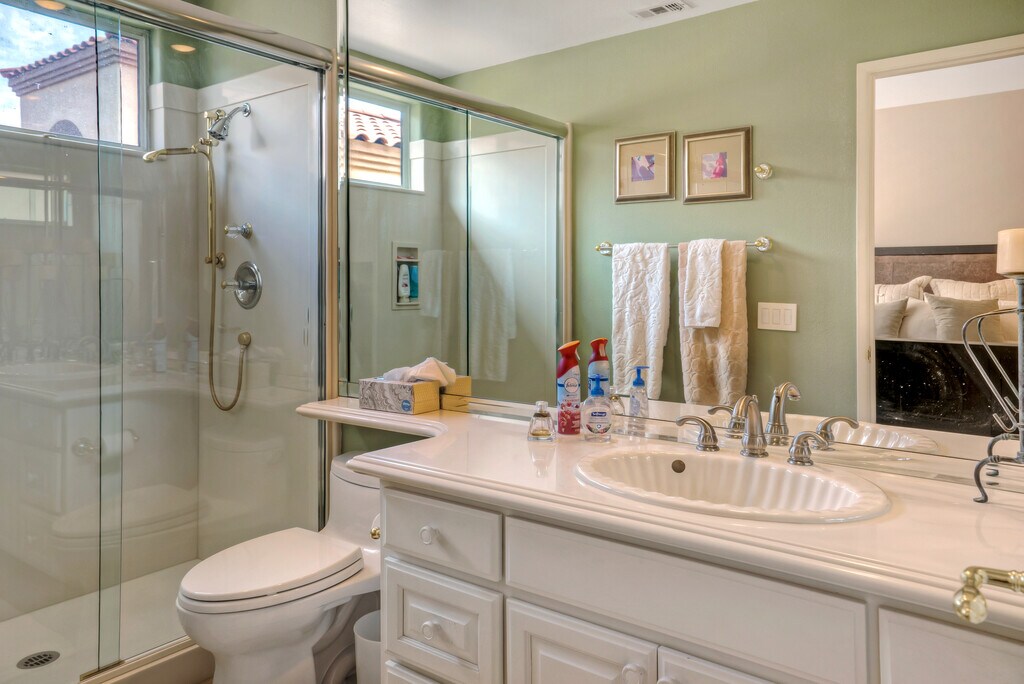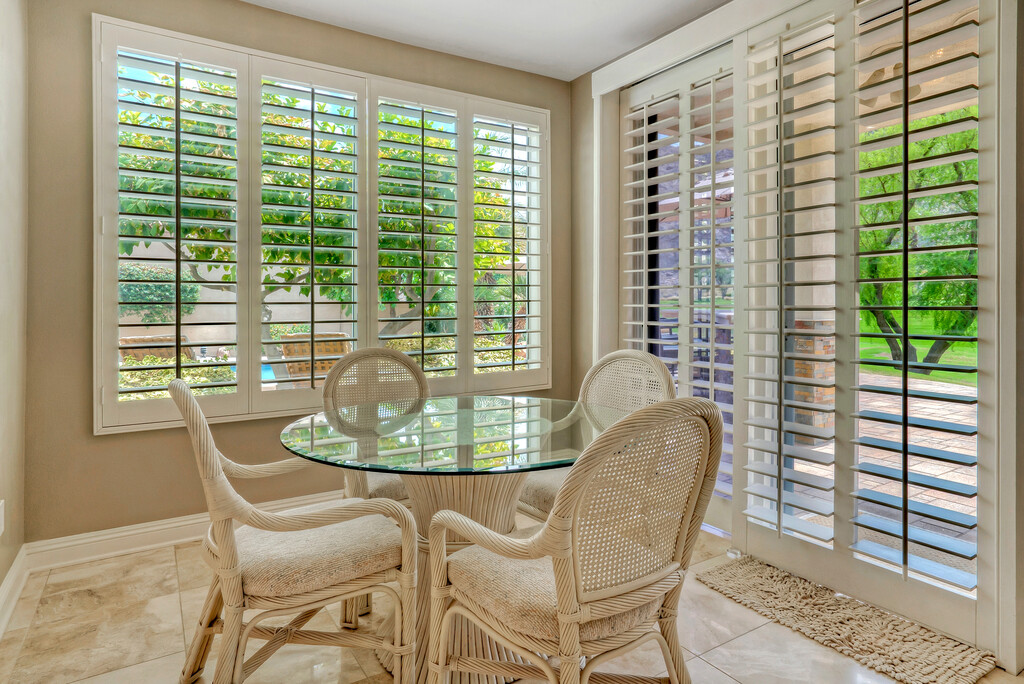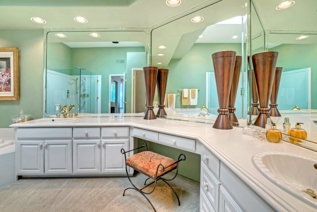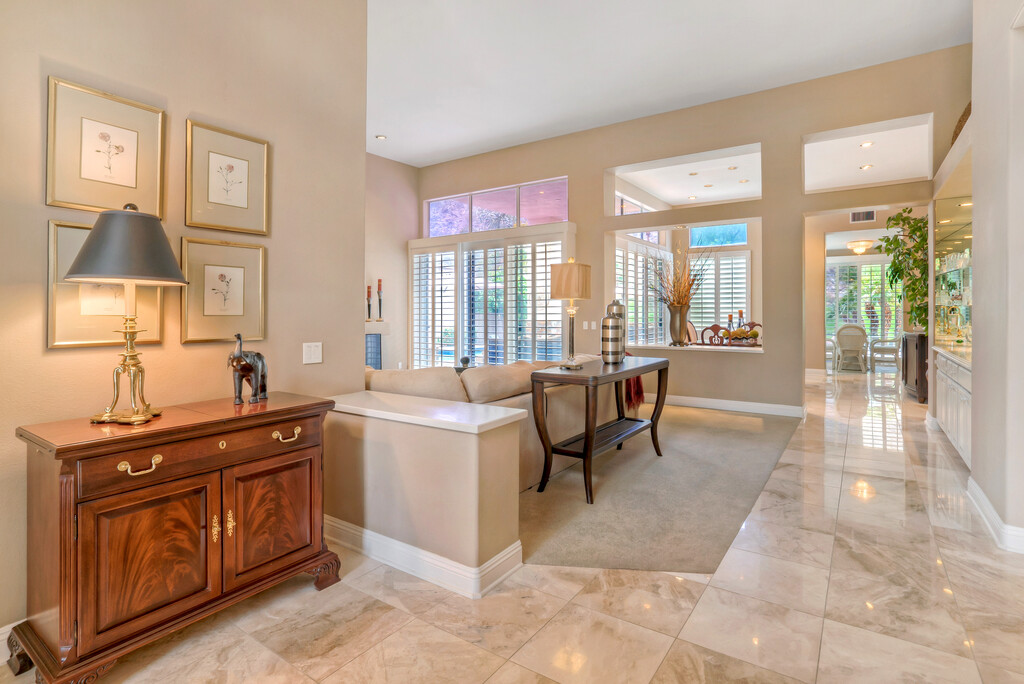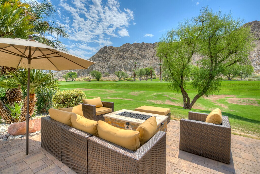 Beautifully furnished house is on a double wide fairway on the Nicklaus Private course inside the Palmer Gate at PGA West. The primary bedroom has a luxurious ensuite bath with a jacuzzi tub. The other two bedrooms have their own ensuite full bathrooms and there is a powder room located in the hall. There is an updated gourmet kitchen and formal dining area and plenty of room in the outdoor area for entertaining guests, The backyard has pool, spa, firepit, and built in BBQ that looks out onto GORGEOUS unobstructed lighted mountain views.