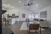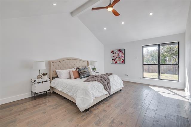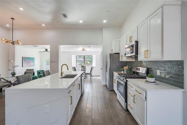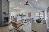 Beautifully renovated contemporary home with high ceilings throughout the living spaces and primary bedroom and lots of natural light! Open concept light filled living space with modern kitchen complete with oversized island, custom all wood slow close cabinetry, quartz counters, stainless appliances and modern tile backsplash! Living room with wood-burning fireplace and modern ceiling fan opens to the kitchen and dining areas. Lots of entertaining space! Large primary suite with vaulted ceiling, en-suite bath with modern soaking tub, large walk-in shower, double vanity and walk-in closet! Additional bedrooms with modern ceiling fans and guest bathroom with contemporary colors, new vanity and fixtures. Huge backyard off the sitting room (plenty of room for a pool and more!) and 2 car garage with built-in storage. Come see this amazing home today!