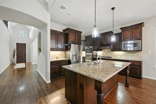 Welcome to the Gorgeous Smart Home in Prosper ISD, located in the highly sought-after neighborhood of Heatherwood in McKinney, TX. This stunning residence boasts four spacious bedrooms, including a second bedroom with a full bath on the main level, and a total of 3.5 bathrooms. The home is equipped with modern amenities such as a refrigerator, washer, and dryer. The office, adorned with elegant French doors, is perfect for those who work from home. The kitchen is a chef's dream with 42-inch cabinetry and high ceilings that add to the grandeur of the home. A bonus room and a pre-wired media room are perfect for entertainment. The home is a tech-lover's paradise with Nest thermostats, smart lighting, a Tesla charger, and smart sprinklers. The patio, complete with ceiling-mounted Bose speakers, is perfect for outdoor relaxation. This home is not just a place to live, but a lifestyle in the prestigious Prosper ISD. Experience the perfect blend of luxury, comfort, and technology in this beautiful home.