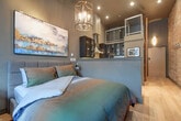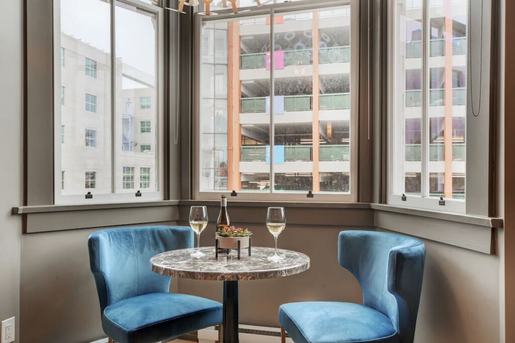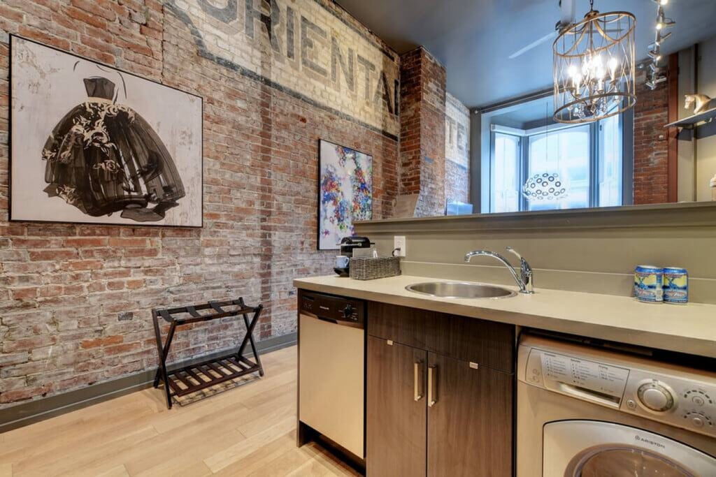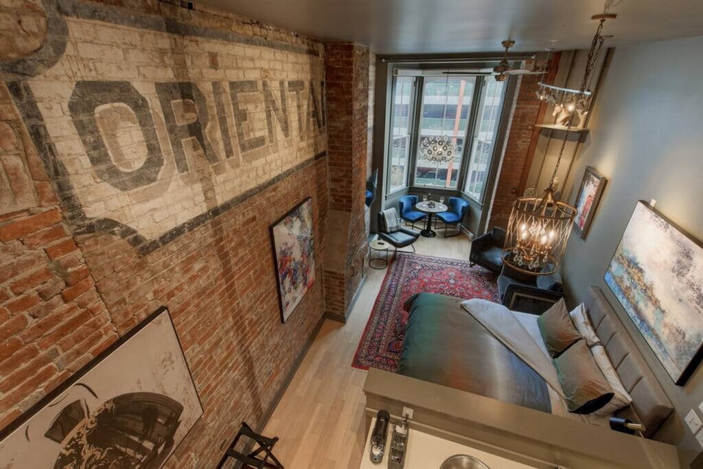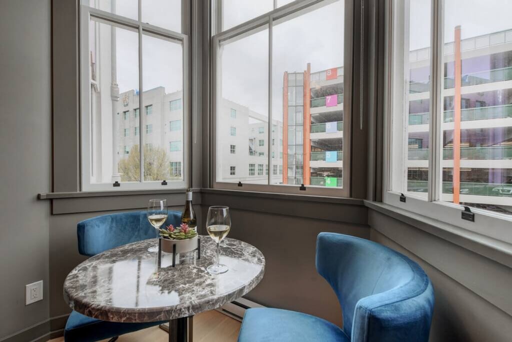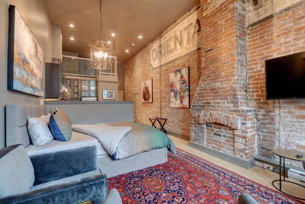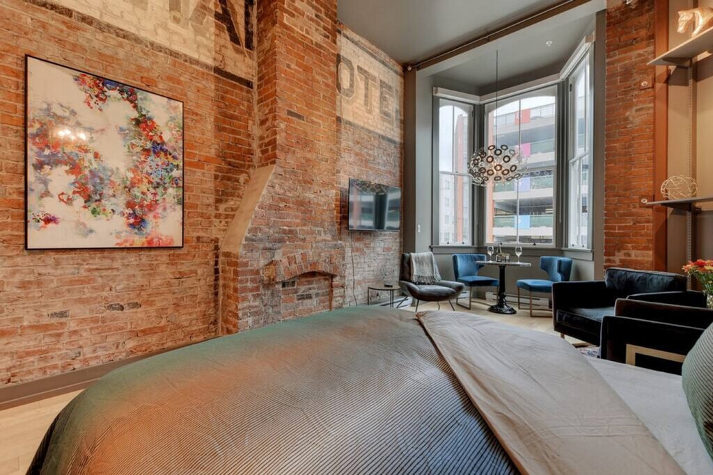 This unique and beautiful loft with sprawling double-height ceilings is centrally located downtown in the beautifully restored Oriental Hotel, a heritage-listed conversion. It contains the original Oriental Hotel sign, the only of its kind in the building. Enjoy access to a shared rooftop patio showcasing views of Downtown, the Inner Harbour, and beyond. This loft is beautifully decorated and features a dining area nestled in the bright bay window offering views up and down Yates Street, plus glimpses of the Inner Harbour. There is also a large ceiling fan which, along with the cross-vented windows, assures year-round comfort. The plush queen bed and fully stocked kitchen and bathroom provide everything you need for a comfortable stay. Entertainment is at your fingertips with a 50" Roku TV with Netflix and high-speed Wi-Fi. Suite does not come with parking, however the parkade offers hourly and daily parking at reasonable rates. Centrally located in a vibrant part of downtown, this loft offers easy access to the best of the city. Ample street parking and a city parkade across the street make it convenient for those with vehicles. Explore the nearby attractions and enjoy the lively atmosphere of the area. Street noise can travel up to the suite from the streets below, so earplugs are provided for all guests. Important house rules include quiet time after 10:00pm. Your health and safety is of the utmost importance during your stay, with professional cleaning staff taking extra precautionary measures including hospital-grade cleaning products after each turnover. [SI]