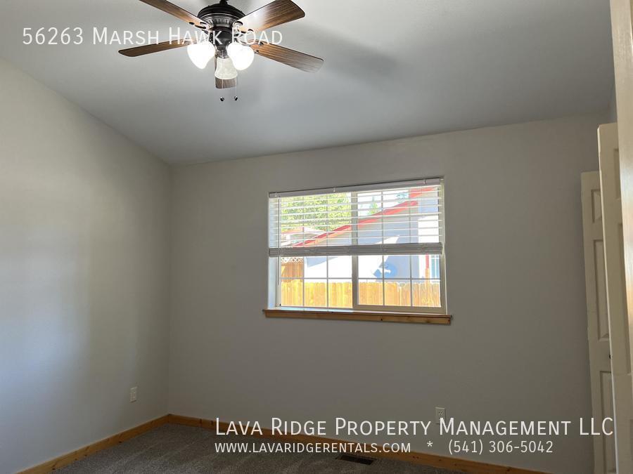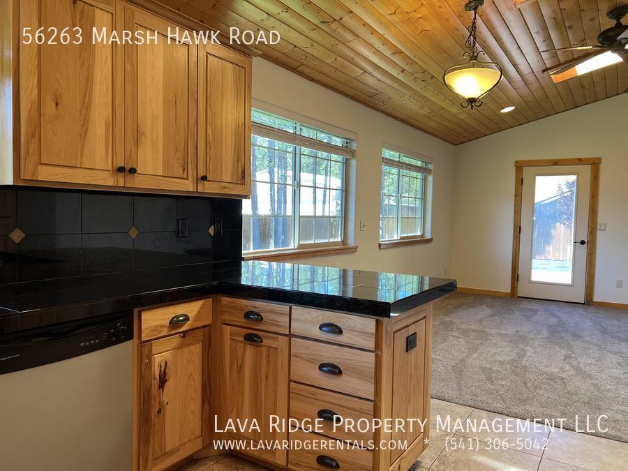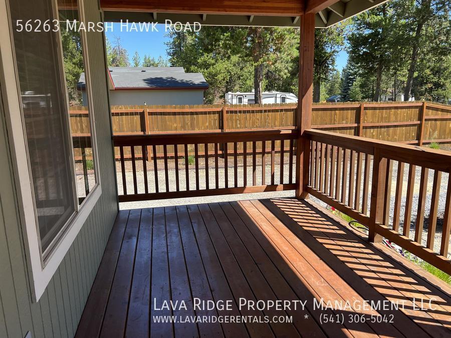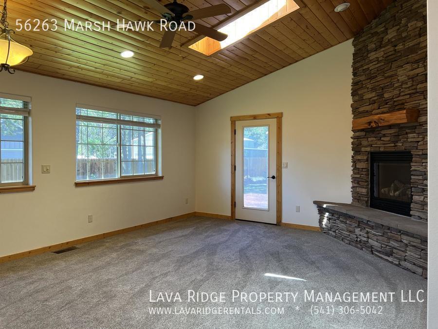 This charming unfurnished single-family home on 1/2 acre, in Three Rivers offers a peaceful retreat surrounded by nature, just a short walk—less than a mile—from the river. Nestled in a quiet wooded setting adjacent to the sought-after Sunriver area and only thirty minutes from Bend, the home provides both tranquility and convenience. The interior feels bright and inviting with vaulted ceilings and abundant natural light streaming through multiple skylights. Both bathrooms include dual vanities, and the primary suite features a garden tub along with direct access to the backyard deck. The propane fireplace offers ample heat and a warm, inviting ambiance—perfect for those crisp Bend nights. A spacious covered porch invites you to unwind and enjoy the serene, seasonal views that make this property so special. Warm wood accents throughout the home create the cozy, cabin-like feel that defines this well-maintained space. Additional amenities include a full two-car garage, a laundry room with washer and dryer hookups plus a utility sink, and a fully fenced backyard with lush grass and full irrigation that your furry friends can enjoy. Tenants are responsible for all utilities and will receive compensation for the portion of the electric service that benefits the shop located at the back of the property, which is not included in the rental. A true gem—available now. Apply today! Appliance Dishwasher Appliance Microwave Appliance Oven/Range Appliance Refrigerator Ceiling Fan(s) Central Heating & Cooling Dog Friendly Double Car Garage Double Sinks Master Bath Driveway Fully Fenced Backyard Landscape Resident Maintains Laundry Room School Caldera High School Lapine Middle School School Three Rivers Elementary Sink In Laundry Room Skylight Storage Shed Vaulted Ceilings W/D Dryer Hook Up Electric Water Resident Responsible Wndw Coverings Wood Blinds
