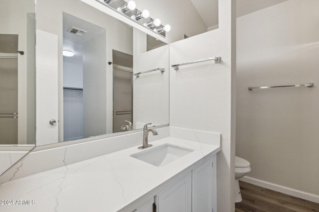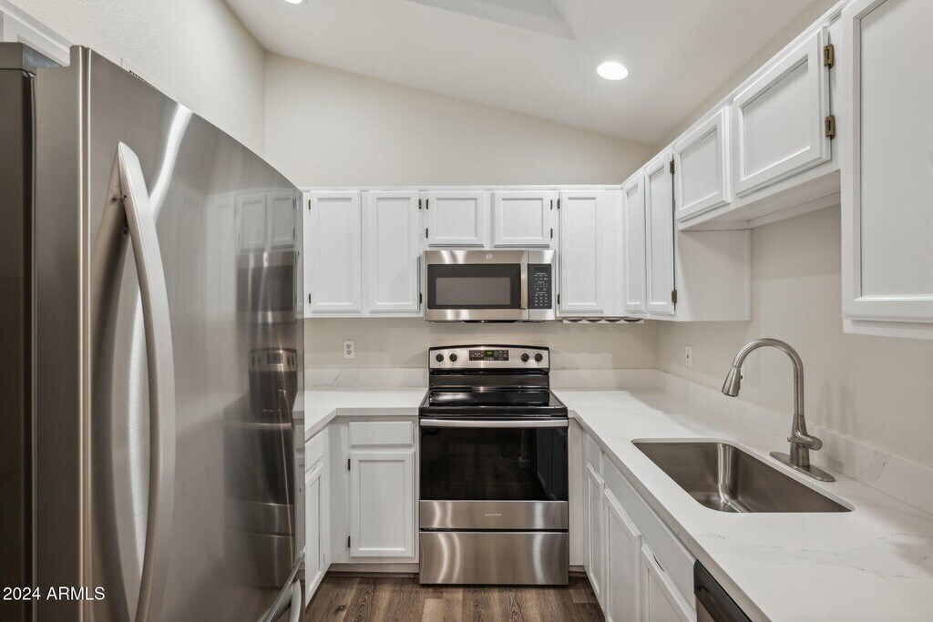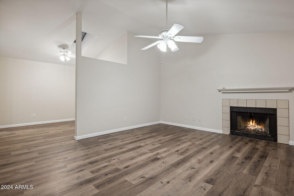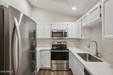 Super clean 2bed / 2bath single story home! Recently renovated with vinyl plank floors,paint,kitchen and bathroom counters,appliances & more- this home is beautiful! Enter to large living room w/ wood fireplace,around to dining area (would make a great office too!) and kitchen. Vaulted ceilings and skylights. Full size washer & dryer in home. 2 car carport. Grass front yard and desert back yard. Home is a quick walk from community pool and nearby bus stop. Quick access to I10,US60,Sky Harbor,shopping and so much more!