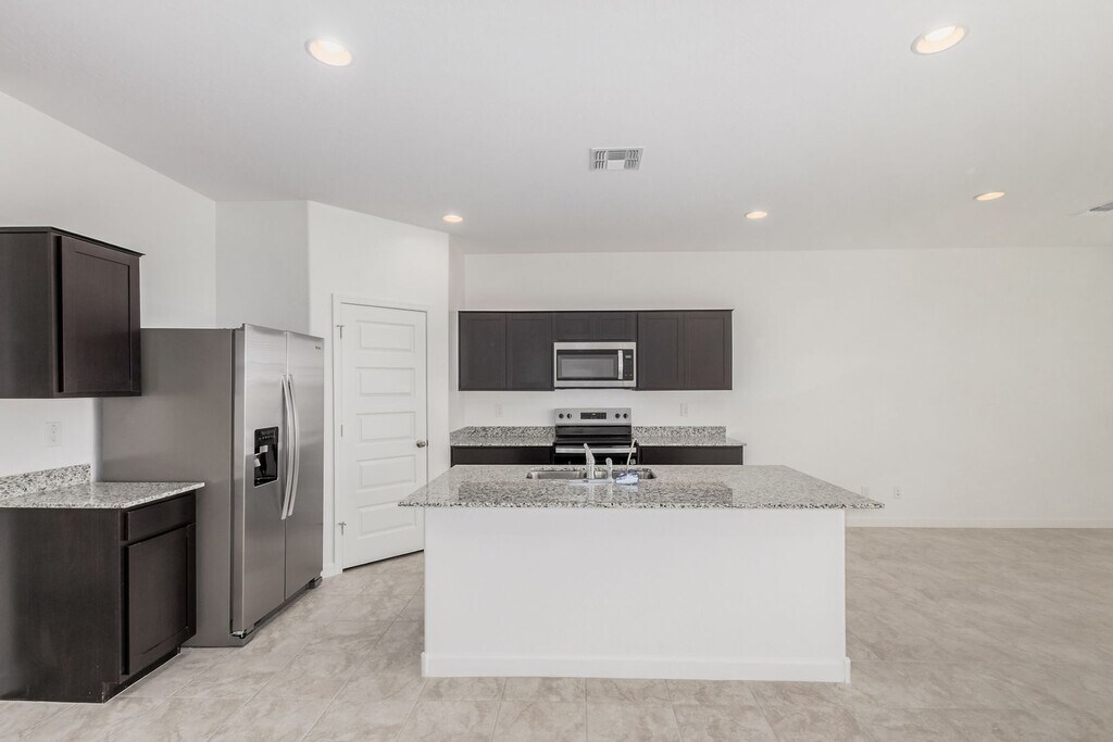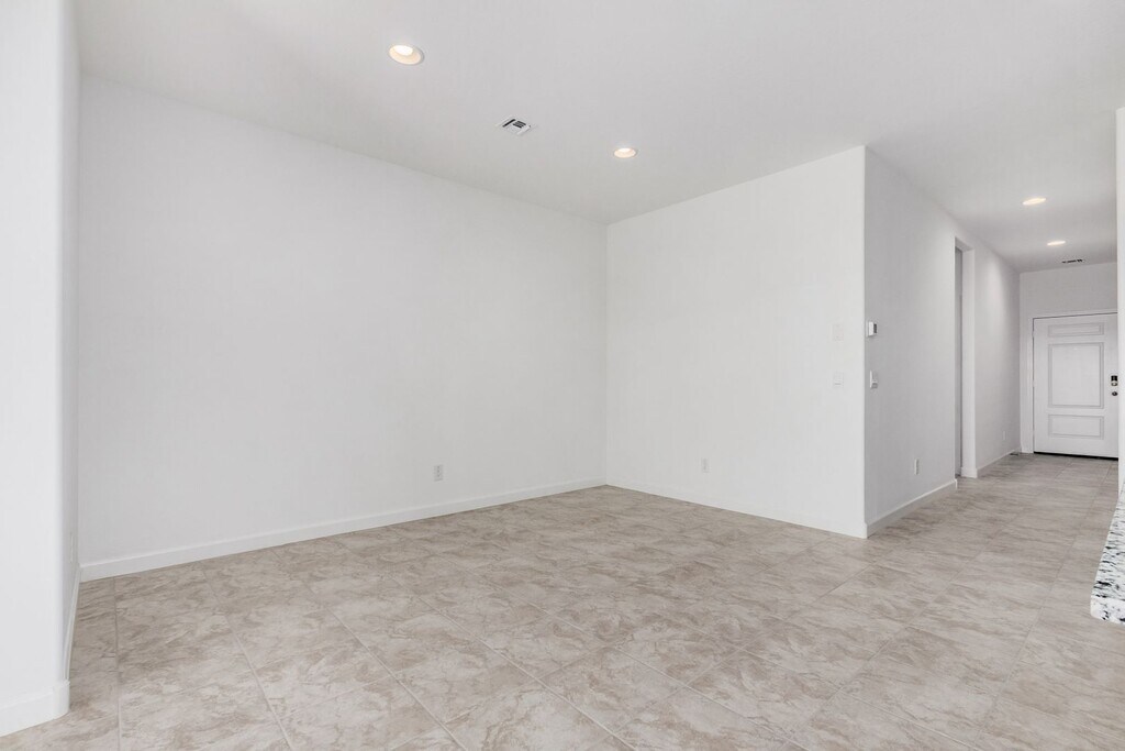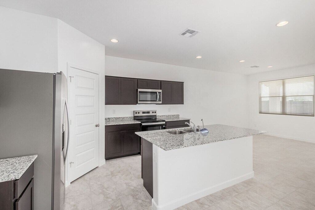 This desirable corner lot home next to open space welcomes you with a 2-car garage, tasteful accents for excellent curb appeal. Discover a captivating open layout with high ceilings, a soothing palette, blinds, and durable tile flooring. The beautiful kitchen boasts quartz counters, tasteful wood cabinets with crown moulding, recessed lighting, stainless steel appliances, a pantry, and an island with a breakfast bar for casual dining. The primary suite showcases soft carpeting, an ensuite with double sinks, and a practical walk-in closet. Spend enchanting evenings in the lovely backyard, featuring a covered patio, stylish pavers, and pristine artificial turf for outdoor activities. This value will surely not disappoint!