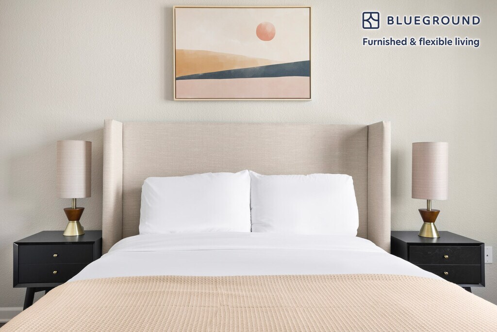 Show up and start living from day one in Emeryville with this spacious one bedroom Blueground apartment. You’ll love coming home to this thoughtfully furnished, beautifully designed, and fully equipped Emeryville home. (ID #SFO1990) The advertised rate of $3,390/month is the lowest available price, based on a 1 month(s) and 28 day(s) stay with a move-in date of February 16, 2028. If you’re looking for a 1-year stay, the rate is $3,880/month. Rates vary depending on the duration of stay, season, and other parameters. For exact pricing and additional pricing components, please visit our website and enter your desired move-in and move-out dates. The rate is applicable when billed upfront; it can be higher if billed in multiple payments. Brokers are welcome to reach out. Were you looking for an unfurnished lease? Try Blueground instead and upgrade from unfurnished to furnished living: - Furnished at rates comparable to unfurnished - No setup or furniture costs - save thousands - Move-in ready - save time, just bring your suitcase Designed with you in mind Thoughtfully designed with bespoke finishes, modern furnishings, and a fully equipped kitchen, you’ll enjoy that “I’m home” feeling with this Blueground apartment. Whether you’re lounging in your cozy living room streaming the latest and greatest entertainment on the smart TV or premium wireless speaker, or getting some well-earned rest on the superior quality mattress with luxury linens, you’ll fall in love with everything this Emeryville apartment has to offer. This apartment also offers in-apartment laundry. Sleeping arrangements Queen Bed, 63in/160cm Amenities Building amenities unique to this one bedroom apartment include an on-site: - BBQ Area - Dryer - Elevator - Swimming pool - Washing machine - Lounge - Parking - Pets allowed Arrival and ongoing support The entire apartment is yours to enjoy! Throughout your stay, you’ll have access to our Client Experience team through the Blueground App. You can schedule additional cleanings, submit maintenance requests, and view our neighborhood recommendations with just a few taps. We’ll share all details upon confirmation of your stay. Ideally Located This furnished apartment is located in Emeryville in Alameda County. The city is set on the San Francisco Bay nestled between Berkeley and Oakland, a prime Silicon Valley location. Pixar is headquartered in Emeryville, along with Electronic Arts' Maxis Software division, LeapFrog, MobiTV, and Sendmail. The city may be small, but there are plenty of places to eat, play, and shop right in town. Most residents use their cars to get around. Emeryville is set near the foot of the Bay Bridge for a quick drive into San Francisco, and also has great highway access. Other things to note Building amenities may have an extra cost. This Blueground apartment has flexible lease options, allowing you to book it for one month, a year, or more. Pets are welcome, though weight limits and breed restrictions apply and may incur fees. Parking is offered based on availability and is subject to a fee. We take great pride in ensuring every photo displayed is shot in our own units with our actual furnishings. That said, we regularly refresh our decor and furniture arrangement, which may differ from what’s pictured. [SI]