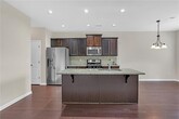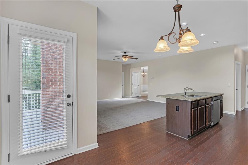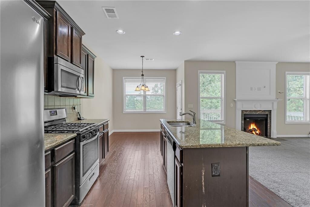 Stunning three-story brick home in prestigious Arlington Point. This luxury residence offers 6 bedrooms, 3 bathrooms, and a finished basement with a full second living space-ideal for multigenerational living. The main level features a two-story foyer, lofted staircase, coffered ceilings, private office, formal dining room, and an oversized great room. The chef's kitchen includes a large island, breakfast area, and walk-in pantry. A main-level bedroom with full bath provides perfect guest accommodations. Upstairs, the owner's suite showcases a tiled shower, soaking tub, and custom walk-in closet, along with a private den/playroom and three additional bedrooms with a shared bath. Step outside to a back deck overlooking a private yard with serene treeline views. Additional highlights include a two-car garage. The finished basement features a second kitchen, living room, 2 bedrooms, hardwood floors, fireplace, and private walkout access to the yard. Move-in ready, this home delivers luxury, space, and true multi-family living potential.
