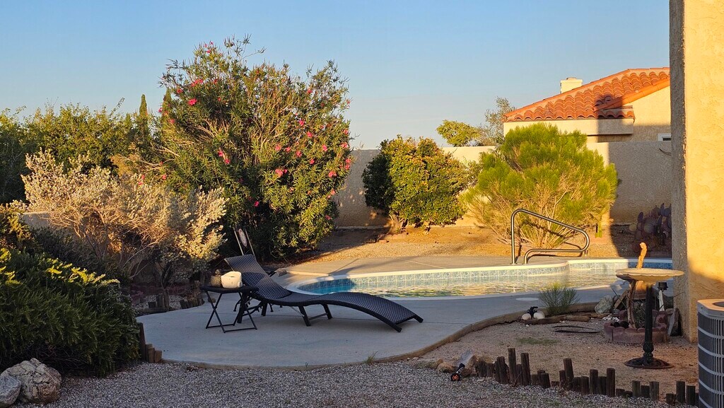 2 bedroom,2 bath POOL HOME on large corner lot. Newly updated kitchen. Large main bedroom. Second bedroom almost as large as main. AC and attached 2 car garage with washer/dryer. Property is set higher than surrounding properties,providing nice views and enclosed by stucco privacy fence. Pool updated with Pentair pool heater and Pentair remote heater and jet control app. Side gate for RV parking