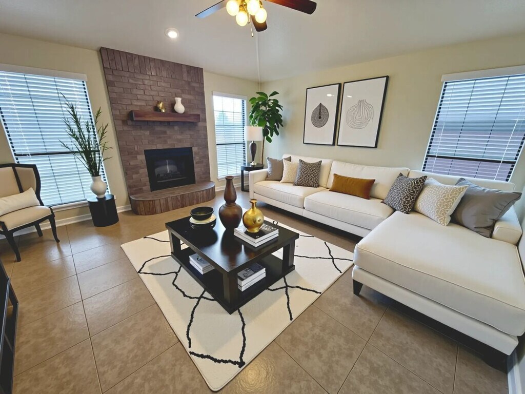 View 360° virtual tour: This 3-bedroom, 2.5-bath home for rent in Killeen, TX features ceramic tile flooring throughout, offering a cohesive look and easy maintenance. The living area includes a brick fireplace, while a bonus room with French doors provides flexible space for a home office or additional living area. The kitchen is equipped with stainless steel appliances and granite countertops, and a half bath is conveniently located on the main level. The primary suite includes a custom closet, and the home also features a dedicated laundry room with washer and dryer connections, a utility sink, countertop space, and storage cabinets. Enjoy outdoor living with a covered patio with ceiling fan and a fenced backyard, along with the convenience of an attached two-car garage. Appointments aren't required to tour. Contact us or stop by our Killeen office to learn more and see this home in person once it becomes available! We are located at 1020 W Jasper Drive, Killeen, TX 76542. Disclaimer: The furnishings or enhancements shown are AI-generated and intended for inspiration only. They may not reflect the actual scale, condition, or current features of the property.