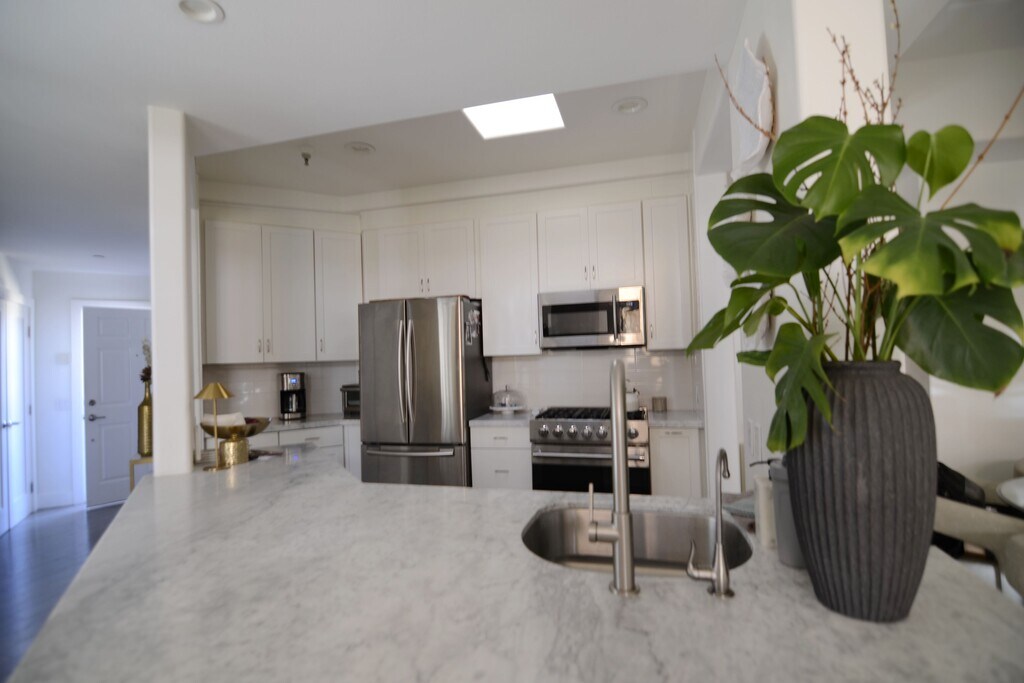 Live beautifully. Step into elevated living and discover a refined balance of sophistication and comfort in this southwest-facing top-floor condominium, where contemporary design and natural light create a haven of luxury. This open-plan amplifies spaciousness while soaring ceilings lift your soul. Spanning 1,281 square feet, this unfurnished Valley Village unit offers a practical layout, tasteful finishes and expansive fenestration. The abundance of cascading natural light engulfs the interior throughout the day. The heart of the home is its refined kitchen with subway tile backsplash, marble countertops, and stainless-steel appliances. Enjoy quick eating at the breakfast bar. The kitchen is anchored by an adjoining dining room that's perfect for intimate dinners or vibrant gatherings. A seamless flow into the living area ensures every occasion feels effortless, whether entertaining friends or enjoying quiet evenings at home. Get comfortable in front of the fireplace on those chilly SoCal evenings. Throughout the main living area wood flooring is found underfoot. This unit shares a seamless blend of natural textures and timeless resources. Two separate sleeping areas with en-suite bathrooms provide privacy and retreat. The spacious primary suite includes lofty ceilings and a generous walk-in closet. Enhanced by a wall of closets and natural light, the secondary bedroom is situated off the hall. The secondary bathroom with a skylight is also convenient to guests. The bathrooms are clad in rich slate tile offering a spa-like serenity. Tasteful resources balance elegance with comfort. Plenty of storage throughout, in-unit stacked washer/dryer in hallway, and comfy cooling central A/C ensure everyday ease, while two tandem parking spaces in the gated garage provide peace of mind. The outfitted gym is perfect for fitness buffs. And, a rooftop deck with BBQ and sweeping views is an ideal area for golden-hour gatherings. Please note the building is undergoing retrofitting affecting the exterior areas of the building with weekday work hours from 7:30am to 4:30pm through January 2026. Rental Terms: Annual: $3,649 Per Month
