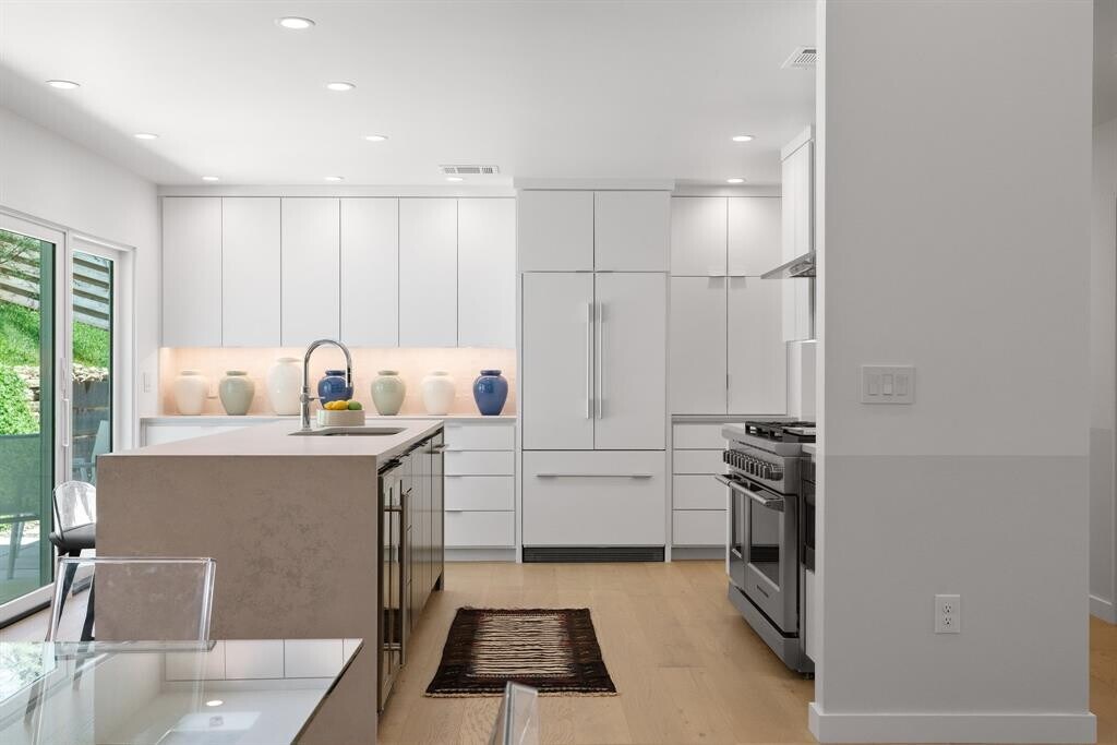 Set on 0.30 acres in the coveted Highland Hills neighborhood, this reimagined 1950s gem combines privacy, architectural integrity, and modern luxury in one exceptional single-story residence. Thoughtfully redesigned with timeless style and high-end materials, the 2,491 sq ft home includes 3 bedrooms, 2.5 baths, and a private-entry office ideal for remote work or flexible guest accommodations. Every space reflects meticulous craftsmanship, from the Level 5 wall finishes and custom wainscoting to the curated lighting by Sonneman. A sophisticated mix of hardwood flooring, terrazzo-style tile, polished marble, and herringbone-pattern Shaw Berber carpet elevates the home’s refined aesthetic. The chef-inspired kitchen blends beauty and performance with concrete-inspired quartz countertops, a striking waterfall island, and premium Fisher & Paykel appliances, including a 48†gas range and built-in refrigerator. In the living room, a marble-veined fireplace serves as a dramatic focal point, while sliding glass doors open to a secluded, fenced yard framed by mature greenery. The serene primary suite offers a luxurious spa-like marble bath and access to its own private patio, creating a peaceful retreat. Additional Features Include: Bold, design-driven laundry room Finished carport with tongue-and-groove ceiling Xeriscaped cactus wall with architectural lighting Electric car outlet Just 10–15 minutes to Downtown Austin and Lake Austin More than a renovation, this is a statement home—where enduring design meets modern convenience in one of Austin’s most cherished neighborhoods.