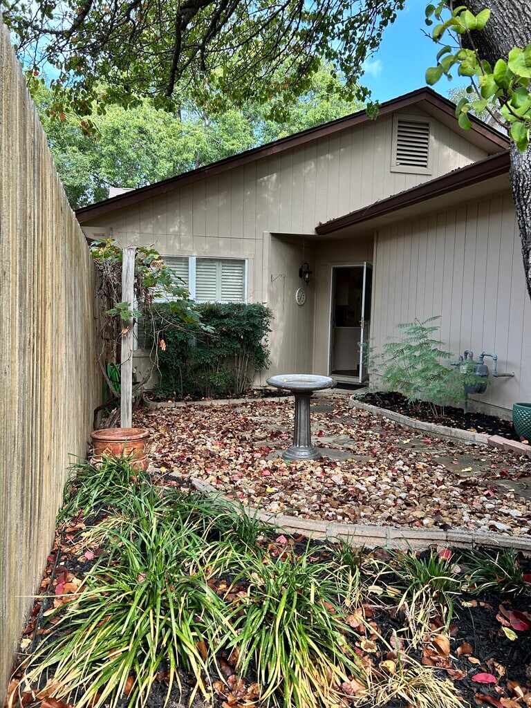 Lovely xeriscaped one story brick garden home in quiet neighborhood. Located in a cul-de-sac with private alleyway entrance to the garage. Two separate, beautiful outdoor spaces beneath mature trees offering seclusion and a peaceful retreat. Enjoy access to well-manicured neighborhood amenities including pool, tennis courts, basketball court, playground, and covered pavilion. This spacious home offers a vaulted living room with a cozy gas fireplace, separate dining room with access to outdoor patio with decking. The kitchen has an island, a built-in desk, a laundry closet with full-size washer and dryer, and access to a secluded patio. Master bedroom features vaulted ceiling with plantation shutters, large bathroom and walk-in closet. Only 10 minutes to I-10, Loop 1604, USAA, Medical Center, UTSA, or Six Flags. Airport is 15 minutes away. Leon Creek Greenway is 2 miles away, accessible by bike along newly established bike path. No pets allowed. Refrigerator, washer/dryer included. Tenant pays all utilities/water/sewer/gas.