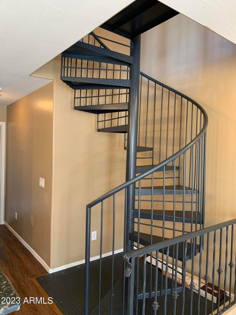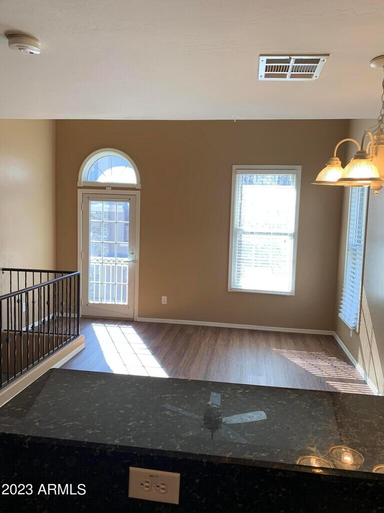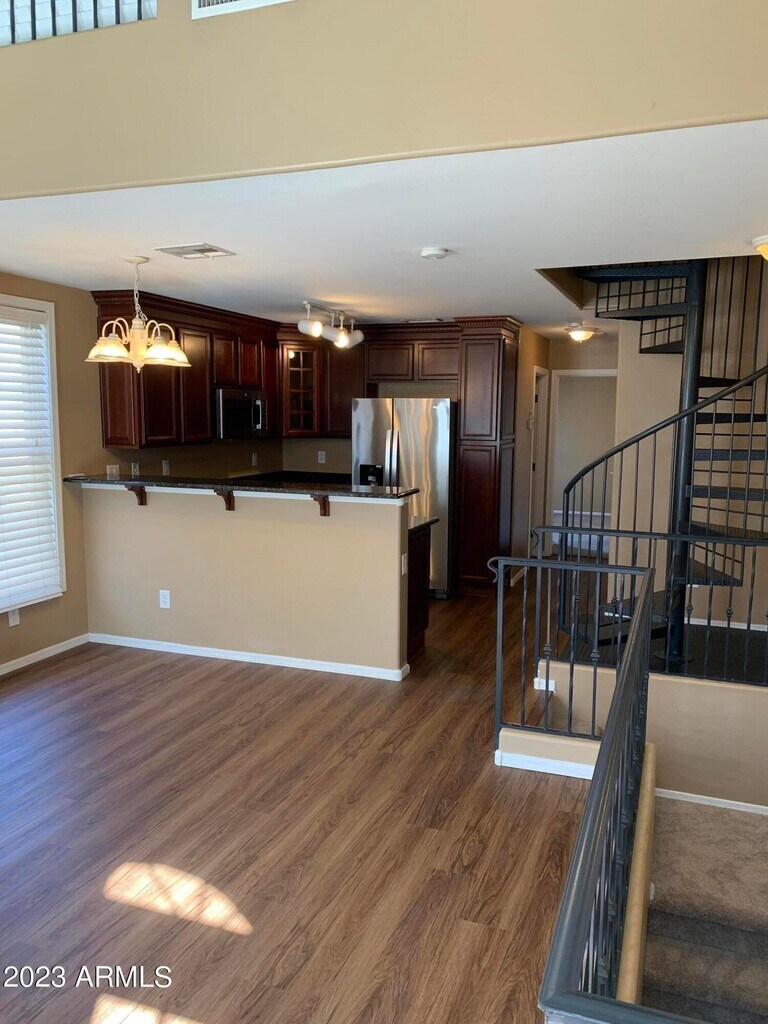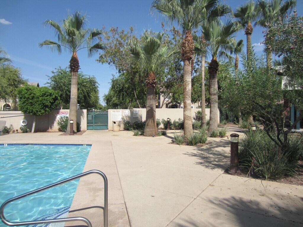 Charming town home style condo with 2 bedrooms,2 baths with laminate flooring and carpet in the bedrooms... Lower level features foyer,laundry room with washer & dryer included and a 2 car tandem garage. Level 2 offers bedroom,full bath,great room and kitchen. 3rd floor is home to a secluded master suite. Neutral carpet,beautiful modern kitchen includes built-in microwave and Fridge,Tandem garage has lots of storage space. The unit is across the street from the community pool. The Copper Leaf Complex is conveniently located... just minutes to ASU,downtown Phoenix,Sky Harbor Airport & freeways. Assistive animals only please.