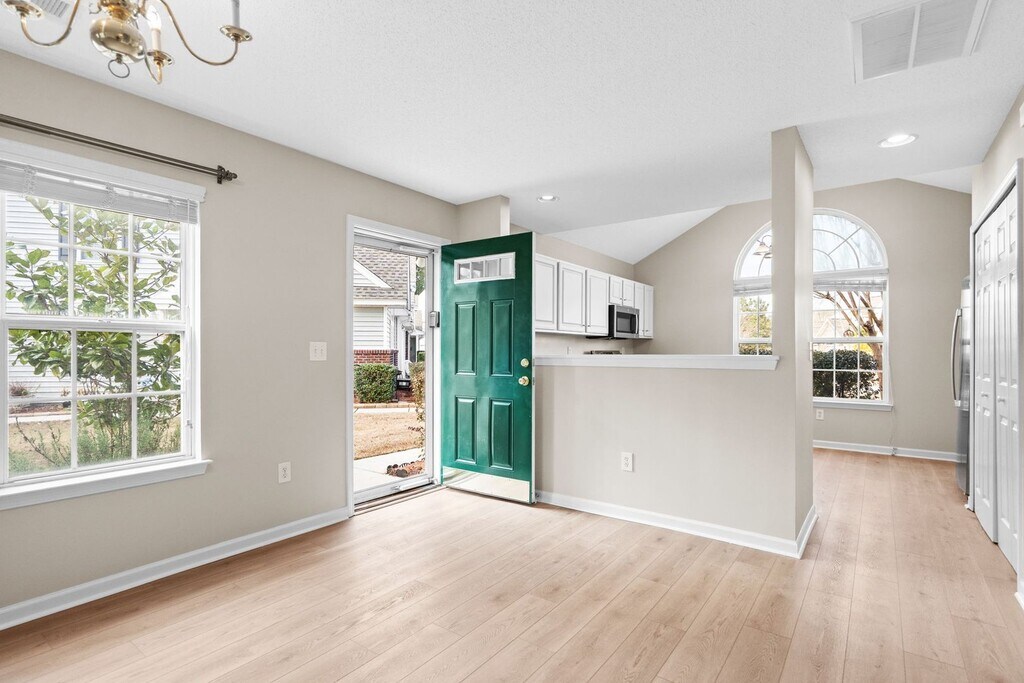 Welcome to a beautifully maintained townhouse in the desirable Riverbend community—this end-unit offers an ideal blend of comfort, low-maintenance living, and access to resort-style amenities. Spacious 2-bedroom, 2.5-bath layout (main-floor primary suite + upstairs bedroom) with approximately 1,292 sq ft of living space. Private 1-car garage + extended driveway for added parking convenience. Inviting living room featuring vaulted ceilings and abundant natural light from large windows; the kitchen offers white cabinetry, tile flooring, and an open flow. Bonus loft area upstairs — perfectly suited for a home office, second living space, or guest area. Relaxing screened-in back porch overlooking green space—ideal for morning coffee or evening wind-down. Community amenities include a pool, clubhouse, scenic boardwalk, and a private dock on the nearby intracoastal waterway for kayaking, fishing or boating. Built in 2006, the home offers modern build quality in a mature, well-established neighborhood. Situated in the 29588 zip code of Myrtle Beach, this property offers a tranquil neighborhood atmosphere yet remains close to everything the Grand Strand has to offer. Nearby: shopping, dining, golf courses, and water-access recreation. Schools in the area include Burgess Elementary School, St. James Middle School, and St. James High School—all within a reasonable distance. This townhouse offers a rare combination of convenience, low-maintenance living, and access to community amenities in a stable, desirable rental market. The main-floor primary suite adds extra appeal for long-term tenants seeking comfort and ease.