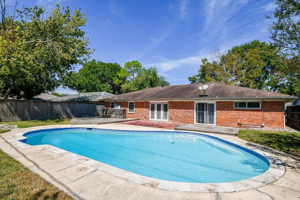 Located in the sought-after Westbury subdivision,this charming 4-bedroom,2-bathroom home offers an open layout and updated interior. Generous living area with modern fan,recessed lighting and french doors that provide plenty of natural light. Kitchen boasts gas stove,gleaming white counter to ceiling tile backsplash and convenient pot filler. Trendy drop down pendant lighting highlights the granite breakfast buffet with built in beverage cooler. Primary bedroom has french doors and updated en-suite bathroom with earth tones. Hallway bathroom boasts shower tub combination and vanity. The highlight of the property is the lush backyard & sparkling pool—perfect for entertaining! Check out the virtual tour! MLS# 72096025