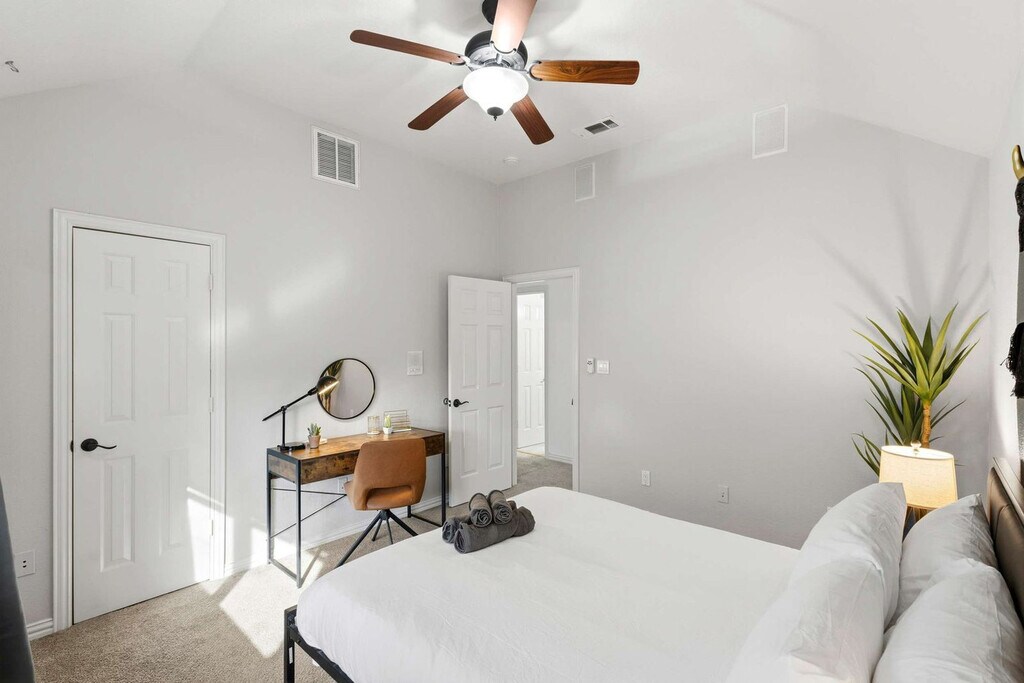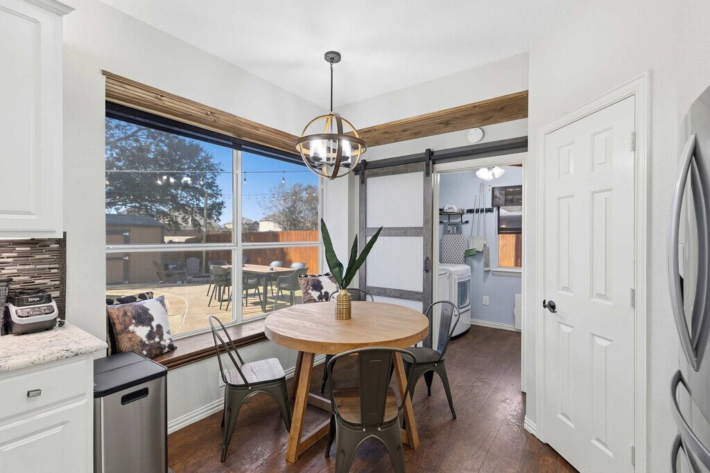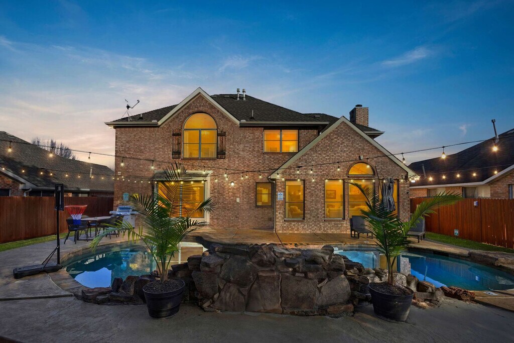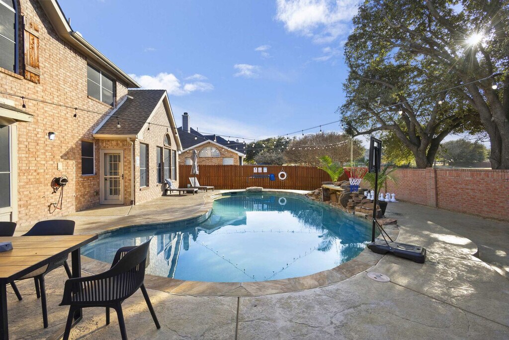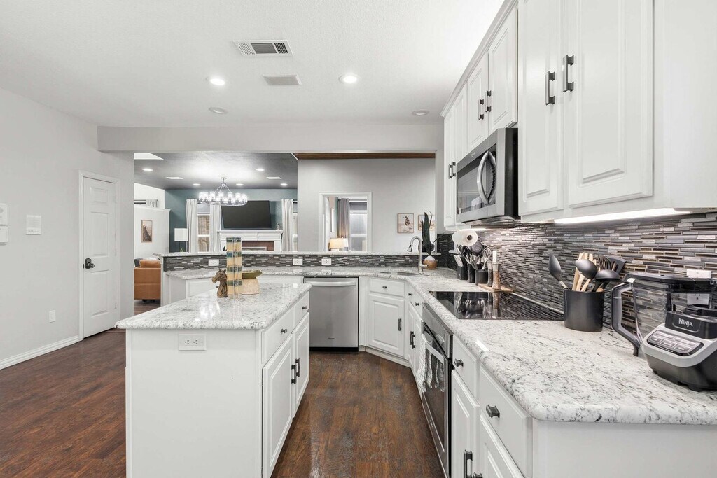 Come and feel at home in this vacation home, your very own slice of paradise! With 5 beautifully curated bedrooms, thoughtfully designed living spaces, and both indoor and outdoor entertainment options, this home instantly says “vacation vibes”. This home caters to both short-term and medium-term stays, making it an excellent choice for corporate housing needs. The fully equipped kitchen features stainless steel appliances, including a fridge, freezer, stove, oven, dishwasher, and microwave, as well as a center kitchen island and bar-stool seating. The dining area includes a dinner table with seating for 6 and an additional breakfast nook with seating for 4. The living room offers comfortable seating with couches and armchairs, a flat-screen TV, and Texas-themed décor. A ping pong table is also available for your use. Free parking is available to all guests. House-trained pets are welcome with a non-refundable pet fee of $150 per pet (maximum of 2 pets per stay). Centrally located in the Dallas-Fort Worth metroplex, Haltom City is a vibrant community with a variety of unique activities plus plenty of surrounding towns to visit! It’s known for its quaint museums, small-town western feel, and shopping. Nearby attractions include the DFW Elite Toy Museum, The Golf Club Fossil Creek, Arcadia Trail Park, Capp Smith Park, Iron Horse Golf Club, AT&T Stadium, Fort Worth Water Gardens, Sundance Square, Fort Worth Stockyards Historic District and Six Flags Over Texas. Smoking of any type is not allowed and violations are subject to a $450 fine plus the cost to clean, deodorize, and repair damages. No parties or events allowed. Only registered guests are allowed on the property. The maximum number of cars allowed are 2 cars in the garage and 2 cars in the driveway. Check-in is at 4pm and check-out is at 10am. [SI]
