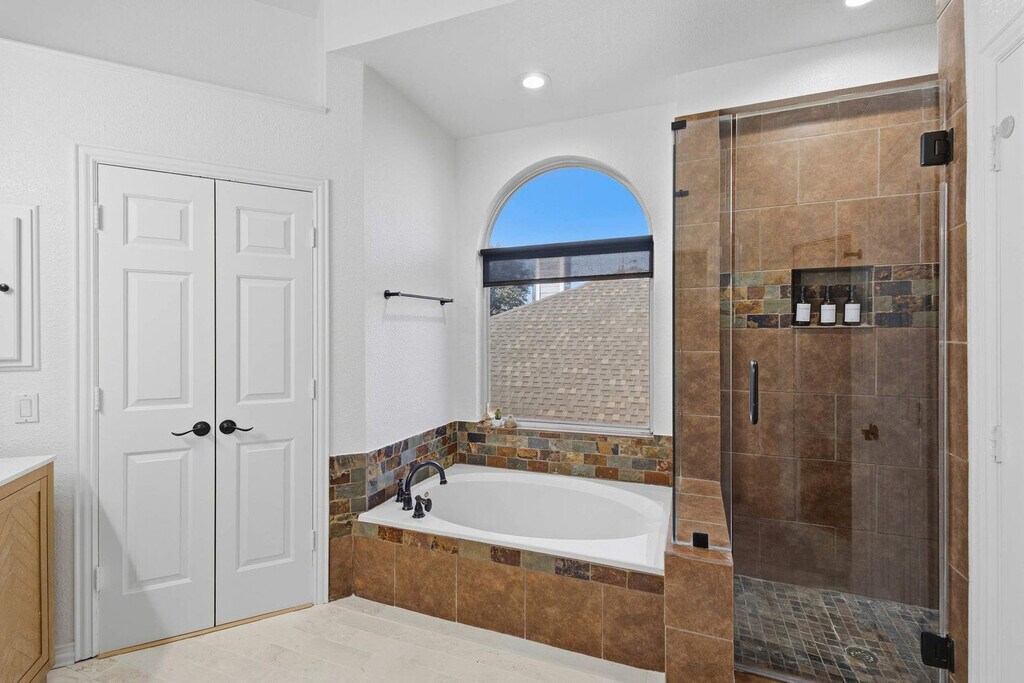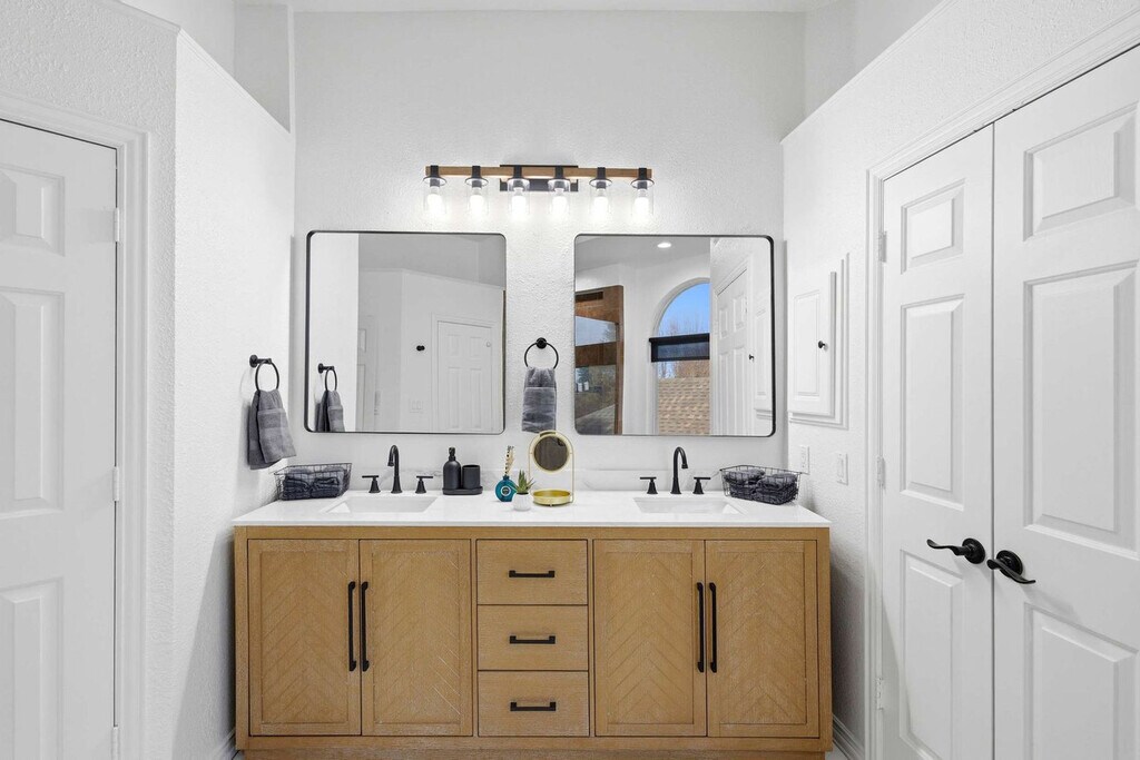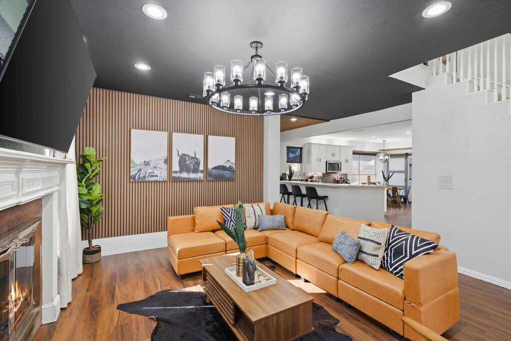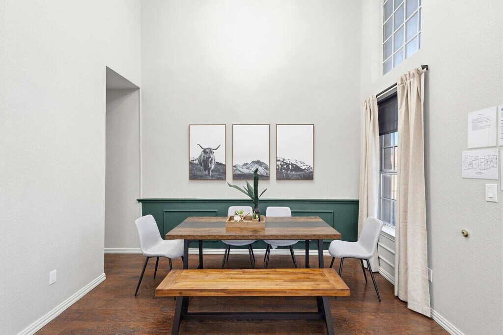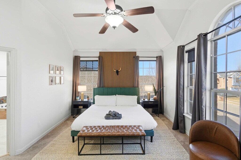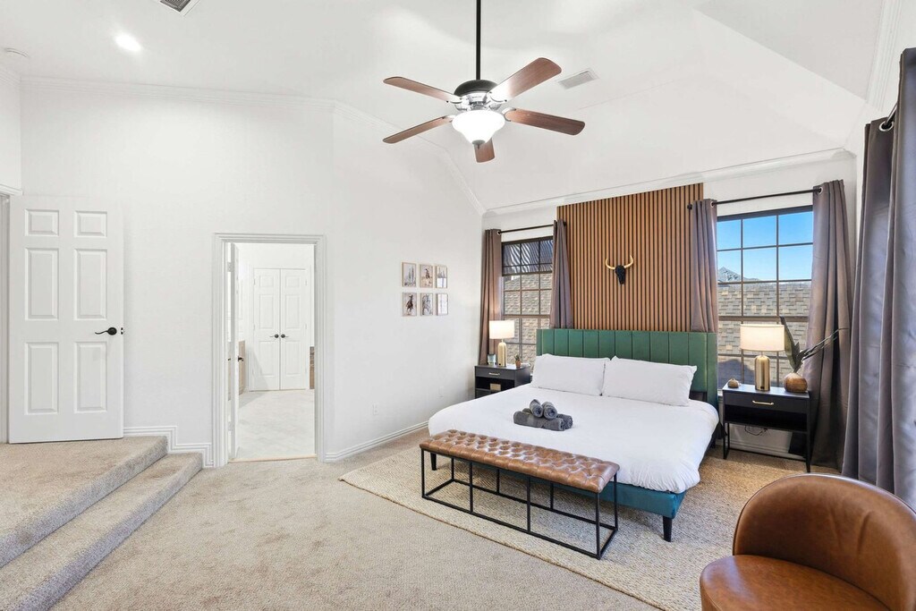 Come and feel at home in this vacation home, your very own slice of paradise! With 5 beautifully curated bedrooms, thoughtfully designed living spaces, and both indoor and outdoor entertainment options, this home instantly says “vacation vibes”. This home caters to both short-term and medium-term stays, making it an excellent choice for corporate housing needs. The fully equipped kitchen features stainless steel appliances, including a fridge, freezer, stove, oven, dishwasher, and microwave, as well as a center kitchen island and bar-stool seating. The dining area includes a dinner table with seating for 6 and an additional breakfast nook with seating for 4. The living room offers comfortable seating with couches and armchairs, a flat-screen TV, and Texas-themed décor. A ping pong table is also available for your use. Free parking is available to all guests. House-trained pets are welcome with a non-refundable pet fee of $150 per pet (maximum of 2 pets per stay). Centrally located in the Dallas-Fort Worth metroplex, Haltom City is a vibrant community with a variety of unique activities plus plenty of surrounding towns to visit! It’s known for its quaint museums, small-town western feel, and shopping. Nearby attractions include the DFW Elite Toy Museum, The Golf Club Fossil Creek, Arcadia Trail Park, Capp Smith Park, Iron Horse Golf Club, AT&T Stadium, Fort Worth Water Gardens, Sundance Square, Fort Worth Stockyards Historic District and Six Flags Over Texas. Smoking of any type is not allowed and violations are subject to a $450 fine plus the cost to clean, deodorize, and repair damages. No parties or events allowed. Only registered guests are allowed on the property. The maximum number of cars allowed are 2 cars in the garage and 2 cars in the driveway. Check-in is at 4pm and check-out is at 10am. [SI]