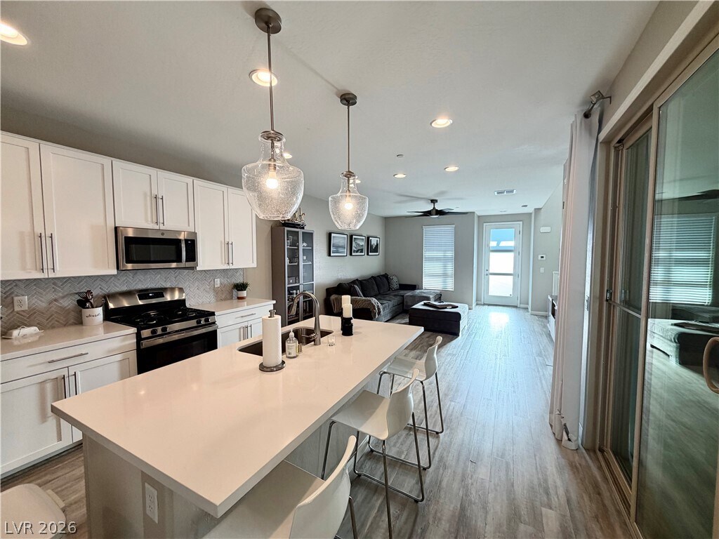 Morro Rock Development in Summerlin West. GREAT location; like new & move-in" ready townhome. 3 bedrooms (all upstairs) and 2.5 bath. Two patios. Front patio has a view of the strip. Kitchen has island, quartz counters and white shaker cabinets. Opens to family room and side patio (perfect for BBQing). Neutral colors inside. Luxury vinyl floor downstairs and carpet upstairs. All rooms have ceiling fans. Window coverings thru out. Walk to lots of Summerlin parks and trails. Townhome is furnished and would rent for $2600 furnished or owner will remove furniture and rent for $2400 unfurnished. All appliances included. 2 car garage and convenient parking across from the unit."