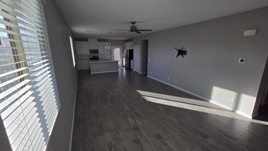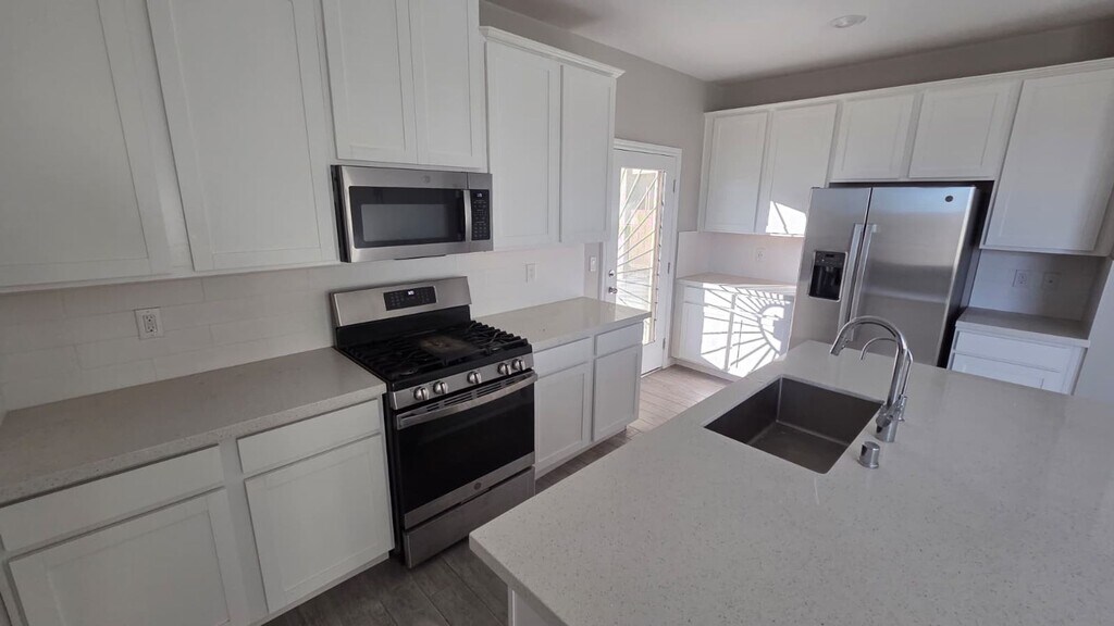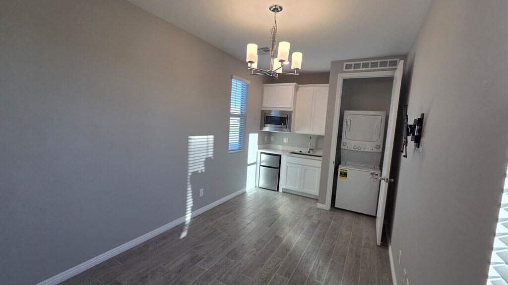 This beautifully maintained 3-bedroom, 3-bathroom home offers a rare and highly desirable layout featuring a fully separated in-law suite, ideal for multigenerational living, guests, or added privacy. The main house showcases an open-concept living and dining area with durable tile flooring, neutral modern finishes, and abundant natural light. The full kitchen features white shaker cabinetry, sleek countertops, stainless steel appliances, and ample storage, while a dedicated laundry room with cabinets, counter space, and a full-size washer and dryer adds everyday convenience. The private in-law suite functions as its own independent living space and includes a separate bedroom and full bathroom, a mini kitchen with cabinetry, sink, microwave, and refrigerator, as well as an in-suite washer and dryer and a private exterior entrance. This flexible setup is perfect for extended family, a home office suite, or independent guest quarters. Additional features include solar panels for improved energy efficiency and reduced utility costs, a whole-home water softener, and a reverse osmosis drinking water system. The home also offers spacious bedrooms with ceiling fans, modern bathrooms with updated fixtures, a finished two-car garage with epoxy flooring, and a low-maintenance exterior with a paver entry. This property combines functionality, efficiency, and flexibility in one thoughtfully designed home, offering a rare opportunity with true suite separation and valuable upgrades already in place.