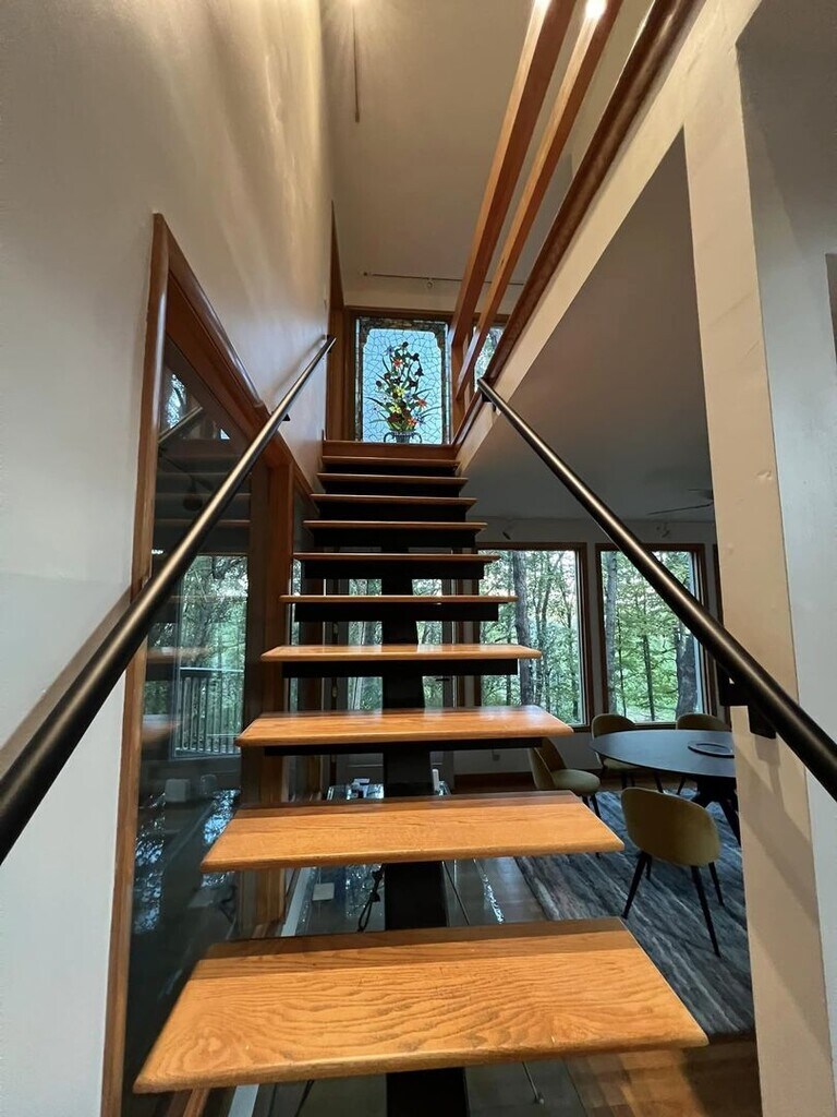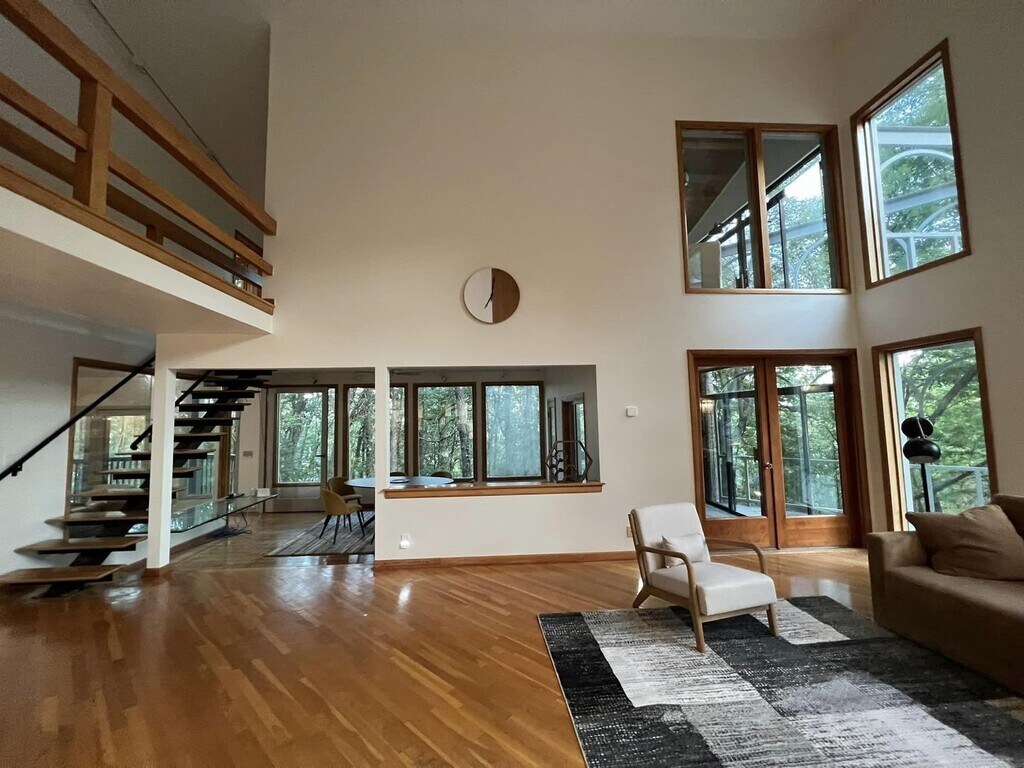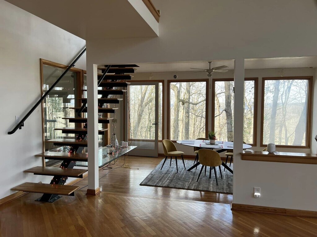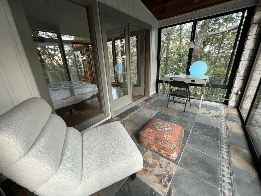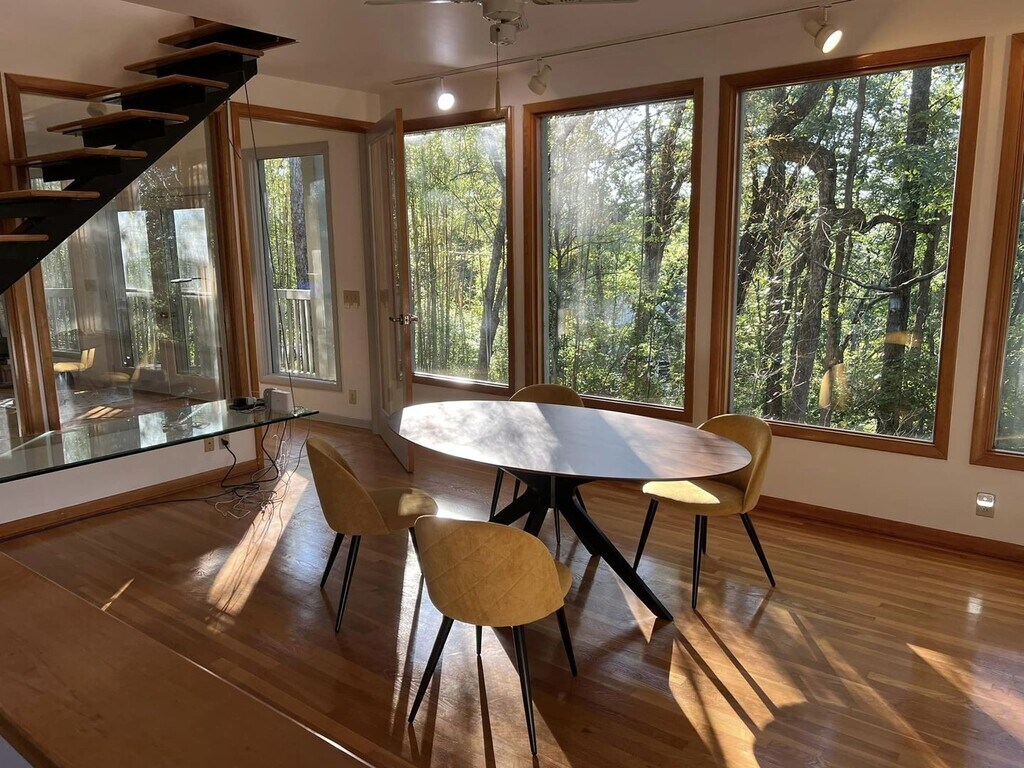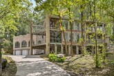 Step into something truly unique. This 4-bedroom, 4-bath contemporary home offers a one-of-a-kind living experience surrounded by nature, with striking architectural details you won’t find in your typical rental. Inside, you’re welcomed by a dramatic wall of oversized arched windows that flood the space with natural light and provide serene, tree-lined views. The expansive open living area features tile flooring throughout, high ceilings, and a flexible layout perfect for entertaining, working from home, or simply enjoying the peaceful setting. The multi-level design adds character and privacy, while each bedroom is generously sized with access to its own bathroom. Unique design elements like stone accent walls, custom windows, and elevated living spaces give this home a modern yet warm feel.Outside, the home is tucked into a wooded lot, offering a private, retreat-like atmosphere. Multiple balconies and outdoor areas create the perfect setting to relax or enjoy the surroundings.