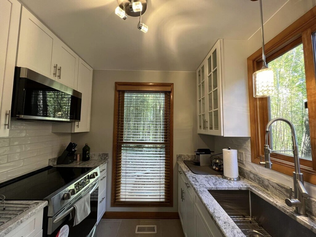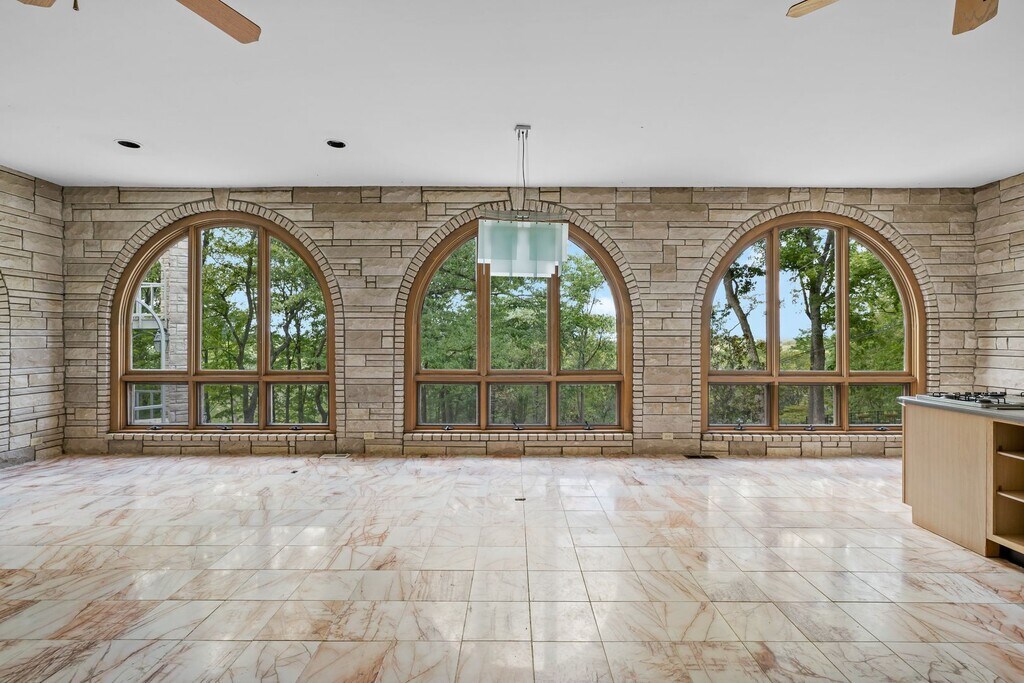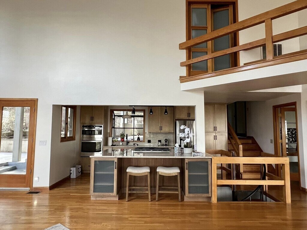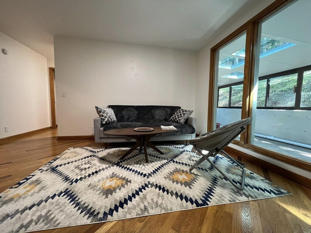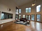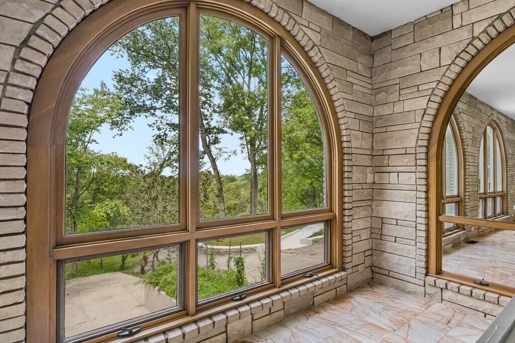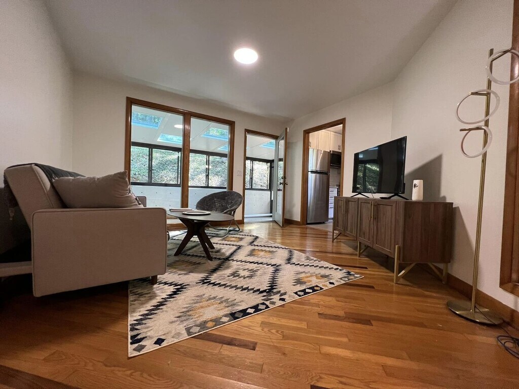 Step into something truly unique. This 4-bedroom, 4-bath contemporary home offers a one-of-a-kind living experience surrounded by nature, with striking architectural details you won’t find in your typical rental. Inside, you’re welcomed by a dramatic wall of oversized arched windows that flood the space with natural light and provide serene, tree-lined views. The expansive open living area features tile flooring throughout, high ceilings, and a flexible layout perfect for entertaining, working from home, or simply enjoying the peaceful setting. The multi-level design adds character and privacy, while each bedroom is generously sized with access to its own bathroom. Unique design elements like stone accent walls, custom windows, and elevated living spaces give this home a modern yet warm feel.Outside, the home is tucked into a wooded lot, offering a private, retreat-like atmosphere. Multiple balconies and outdoor areas create the perfect setting to relax or enjoy the surroundings.