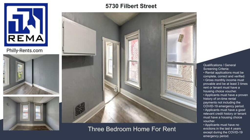 Virtual tour: This two-story Philadelphia residence at 5730 Filbert St offers a compact yet functional living space of 690 sq. ft. The home comprises five bedrooms, including a primary bedroom of 150 sq. ft., and one bathroom. The interior showcases a consistent color scheme with gray walls and white trim, creating a cohesive and modern ambiance. Newly installed light-colored wood-look flooring runs throughout, enhancing the sense of space and brightness. Large windows in each room provide ample natural light and street views, some offering glimpses of greenery. The bathroom features a white vanity, medicine cabinet, and practical amenities. The kitchen, while compact, includes essential appliances such as a stove and microwave. The property's layout includes a hallway, staircase, and multiple bedrooms spread across two floors, with the ground floor measuring 340 sq. ft. and the upper floor 350 sq. ft.. White paneled doors and detailed moldings add character to the space. The renovation strikes a balance between maintaining some original architectural elements and introducing contemporary updates, resulting in a fresh, livable environment in an urban Philadelphia setting. Qualifications / General Screening Criteria: • Rental applications must be complete, correct and verified. • Gross monthly income must provable and be at least 3 times rent or tenant must have a housing choice voucher. • Applicants must have a proven history of on-time rental payments not including the COVID-19 emergency period. • Applicants must have a good relevant credit history or tenant must have a housing choice voucher. • Applicants must have no evictions in the last 4 years except during the COVID-19 emergency period. Consumer Notice - Real Estate Management Advisors, LLC in an exclusive agent of the landlord. Real Estate Management Advisors, LLC - REMA Licensed Real Estate Broker Property Manager Servicing Commercial & Residential Properties in the Philadelphia area. Check out more properties for rent at Like us on facebook at