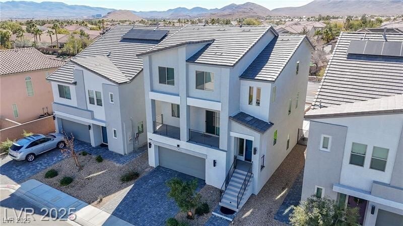 Welcome to this beautiful three-story home located on a quiet cul-de-sac in the sought-after Southern Highlands community. Built in 2022, this 5-bedroom, 3.5-bath home offers a flexible layout perfect for modern living. The first floor includes a private guest suite with its own living area and full bath—ideal for guests or multi-generational living. The second floor features an open-concept design with a spacious kitchen, quartz counters, stainless steel appliances, and a large island that flows into the living and dining areas. A private balcony adds to the indoor-outdoor feel. Upstairs, the primary suite offers a walk-in shower, dual sinks, and ample closet space, along with three additional bedrooms. The home includes a two-car garage, cozy fireplace, and a low-maintenance yard, all in a well-kept HOA community with low monthly dues. Homeowner pays for solar, sewer, and trash and your NV Energy bill will be minimal.