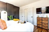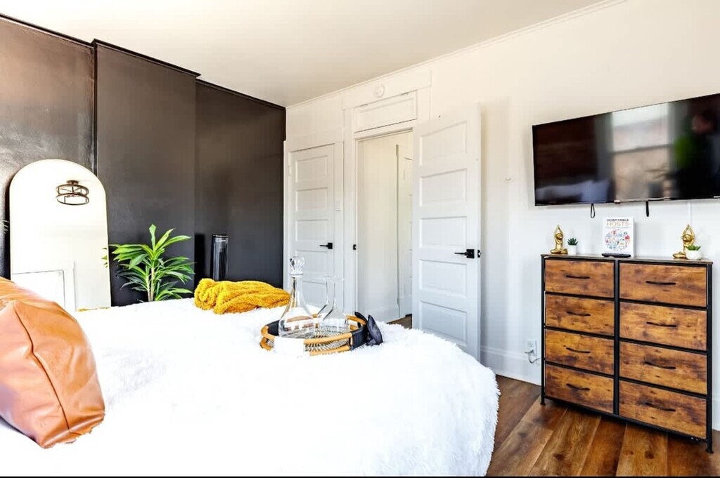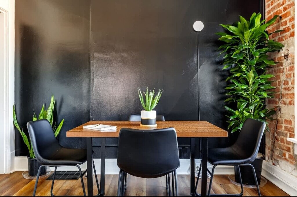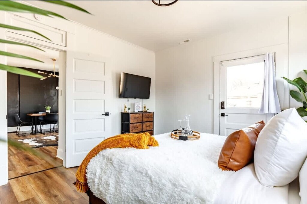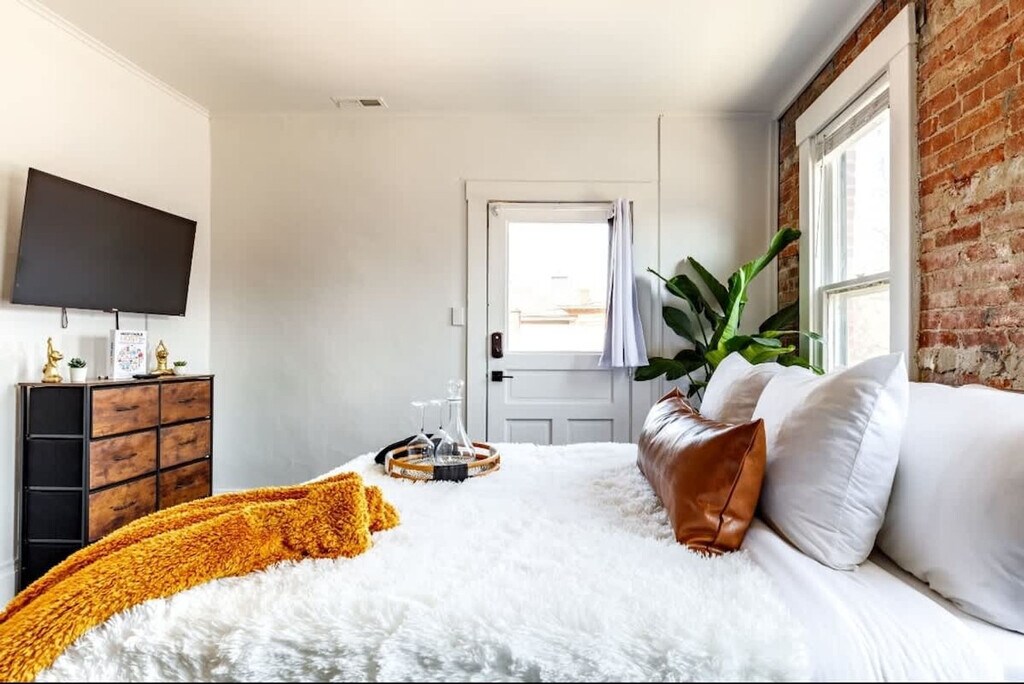 Feel at home in this centrally located 2-bedroom apartment in Columbus, Ohio. Located on the second floor, there is a flight of steps to reach the front door, which is located at the back of the home. This apartment is filled with gorgeous rare plants, upscale decor, and original hardwood floors. It features a fully equipped kitchen with high-end appliances, high-speed internet, and smart TVs in the living room and bedrooms. For your comfort, there are tower fans and white noise machines, a hair dryer, and a handheld steamer. Pets are welcome for a fee of $40 per pet per night. Street permit parking is available for one vehicle; additional permits are available for $15 per additional vehicle per night. Early check-in and late check-out options are available for an additional fee. The location is perfect for exploring the area's restaurants and bars on North High Street. The Book Loft of German Village is just around the corner, and the Short North District is a short drive away. Other nearby attractions include the Greater Columbus Convention Center, Nationwide Arena Stadium, Scioto Audubon Metro Park, and Ohio State University campus. Some city or neighbor noise is possible due to the central location and shared wall with the neighboring unit; white noise machines and fans are provided in every room. No plants in the home are to be moved. No loud music is allowed at any time, and quiet hours are from 9 p.m. to 7 a.m. (noise-detecting technology may be used to monitor excessive noise levels). No parties, small gatherings, or events are allowed (exterior video surveillance may be used to monitor activity). Smoking, marijuana, firearms, illegal substances, or any illegal activity are prohibited on the property; smoking is allowed outside the home only. No additional (unregistered) guests are allowed unless under the reservation guest count; a $50 extra guest fee will be charged per extra unregistered guest per night, and a $300 additional cleaning fee for excessive extra guests will be charged on top of the extra guests house rules violation fee. No photography or any commercial use is allowed on the premises without written permission. Tampering with exterior surveillance, noise monitors, and smoke sensors will lead to immediate cancellation with no refund, as well as a $300 violation charge. Any late check-outs will result in an additional charge of $100. Breaking any of the house rules will result in a charge of $500 each, subject to a charge per occasion and per broken rule separately. Includes a dedicated workspace. The original hardwood floors and staircases may not be suitable for children. The clawfoot bathtub in the bathroom may not be suitable for elderly. Registration Number: 20234440 [SI]