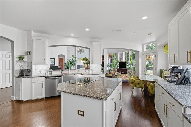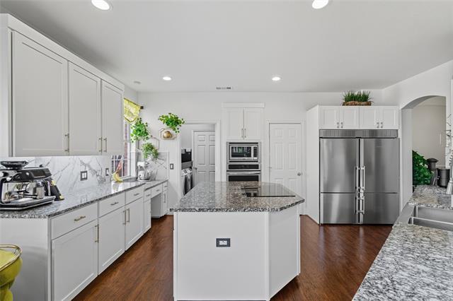 Discover this spectacular home in the highly sought-after Lone Star Ranch community, a Frisco gem that combines luxury living with unparalleled convenience. Perfectly positioned on a lush green belt, this property is a rare find, offering walking distance access to all three exemplary Frisco ISD schools. This home is completely updated and move-in ready. The gourmet kitchen is a chef's delight, featuring sleek stainless steel built-in appliances, including a high-end 60 inch Liebherr side-by-side refrigerator and freezer combination package. The open-concept design flows seamlessly into the main living areas, ideal for both daily life and entertaining. The flexible floor plan offers a spacious primary suite, and the option of four bedrooms or a dedicated media room, along with a sizable game room. The bathrooms have been beautifully remodeled, showcasing modern fixtures and finishes. This property is a true smart home, equipped with a comprehensive suite of high-tech features for comfort, security, and efficiency: Nest 3-piece outdoor security camera system Nest 2-piece smart thermostat system Ring smart doorbell and door handle Smart sprinkler and outdoor lighting Two Google Home devices to manage all smart features Additional high-value features include a fully paid-off solar system for significant energy savings and a Tesla Wall Connector 48A in the garage for EV charging. The garage also boasts a commercial-grade utility sink (60x30) for added functionality. Enjoy the incredible amenities that Lone Star Ranch offers, including a state-of-the-art fitness center, clubhouse, resort-style pools with a thrilling water slide, and a stocked lake. High-speed internet is available via WeLink at an incredible rate of just $1 per month for the next 5 years, with the option to extend. Don't miss the opportunity to see this outstanding home. it's a must-see for anyone seeking the perfect blend of modern luxury and a vibrant community lifestyle.
