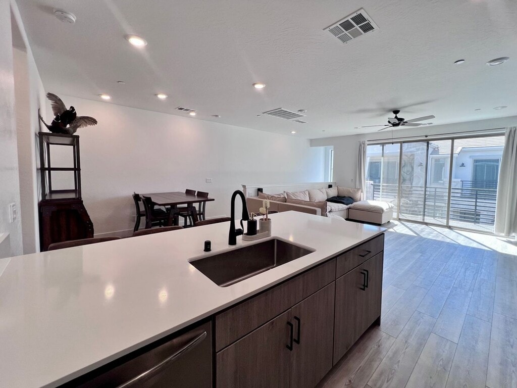 CLICK HERE to schedule a showing: 2 bedroom | 2 full bathrooms | 1,383 sq. ft. | 2023 Build Move in Ready. Located in the desirable gated community of Veneto Park. This bright, lovely townhome is located near shopping, restaurants, easy access to Fwy 168 and only 2 miles from Old Town Clovis. Energy Efficient including Solar Panels. Lower Level Features a Primary Suite including a spacious bathroom with open shower. Laundry room featuring a washer and dryer. Direct access to the 2-car garage. Upper Level features an open living space with sliding doors that lead to the patio for outdoor living. Open concept Kitchen features quartz countertops, stainless steel appliances, refrigerator, dishwasher/disposal, gas range and oven, and built-in microwave. 1 additional bedroom featuring a full bathroom, and spacious walk-in closet. Ceiling fans through out, luxury vinyl plank in main living areas, carpet in bedrooms. HOA Included. Community Amenities: Veneto Park offers a gated entry, front yard care, trash services, a sparkling pool with a lounge area, outdoor showers, and restrooms. No pets. No smoking. Credit score above 650 required. Renter's insurance is required. Resident responsible for all Utilities, PG&E, and TrueUP. Cross streets Herndon and Peach. Clovis Unified School District. Call to schedule a showing or to contact the office. DRE# 01901101. All information is deemed reliable but not guaranteed and is subject to change.