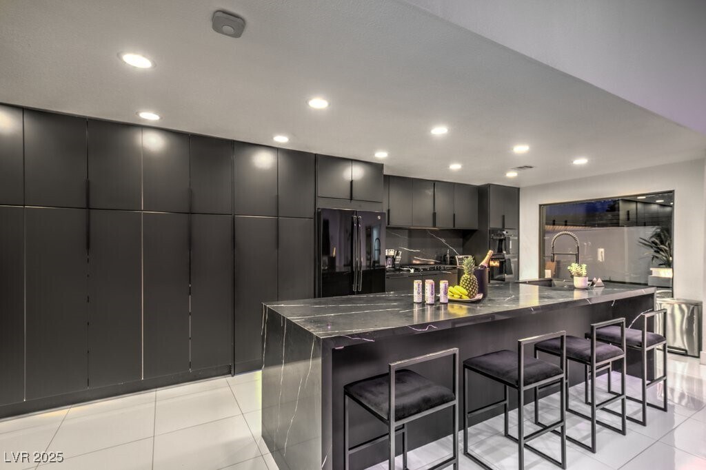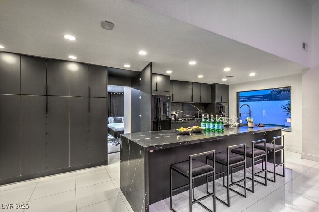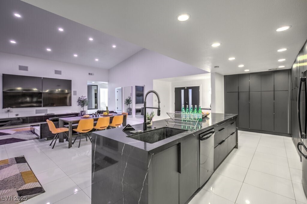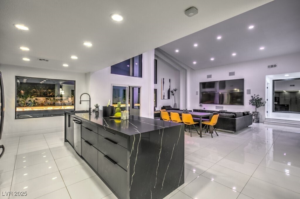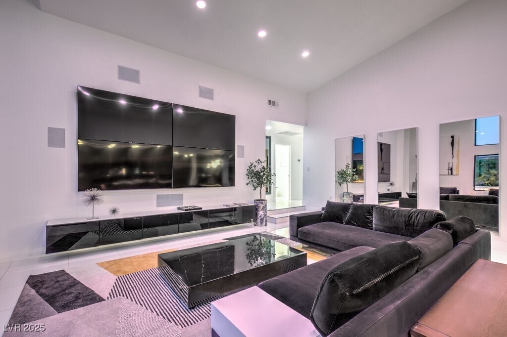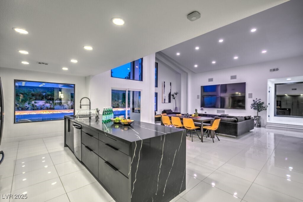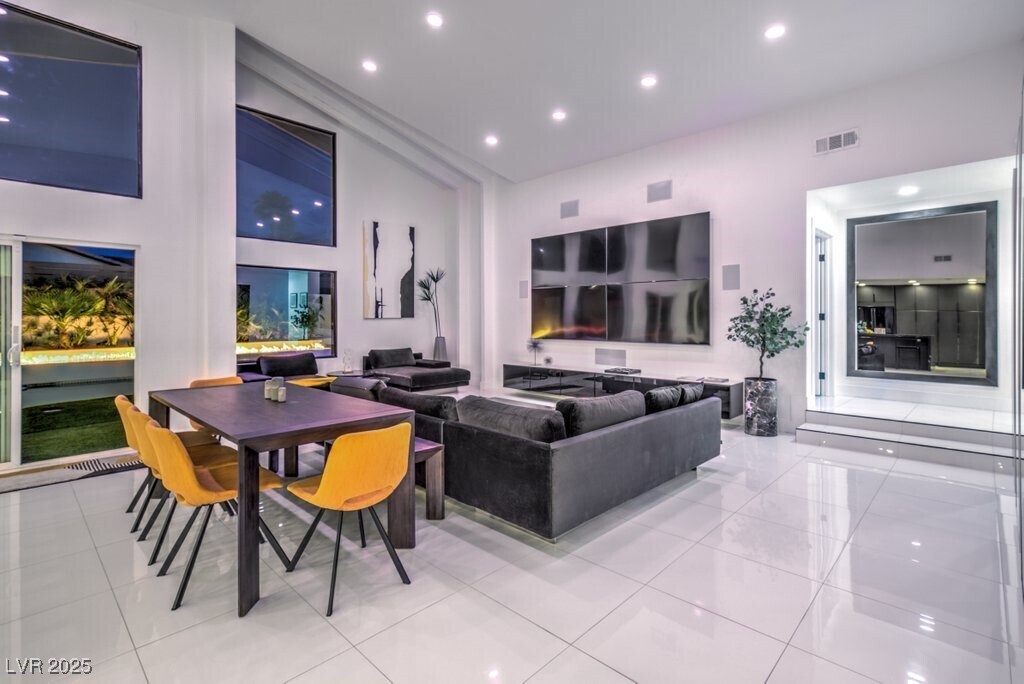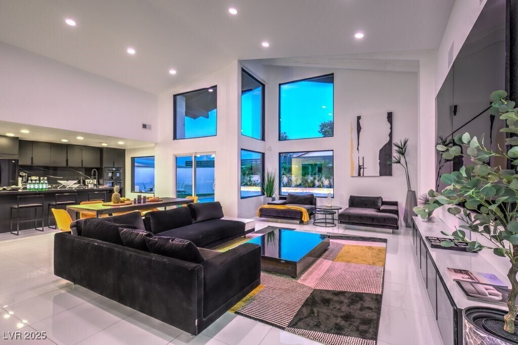 Set on a rare half-acre lot with no HOA, this ultra-modern single-story estate has been completely reimagined with impeccable design and high-end finishes. Offering 5 bedrooms and 4.5 bathrooms, the home is as functional as it is stunning. There are two primary suites—one tucked away behind the kitchen for ultimate privacy, and the main suite designed as a spa-like retreat with a 100 SF marble shower, lighted vanity lounge, and a custom walk-in closet. Soaring 12-foot ceilings with app-controlled LED lighting, a smart NEST system, and keyless entry elevate convenience throughout. Outdoors, enjoy a resort-style backyard with a heated pool and spa, a full-length linear fireplace, covered patio, and a private cabana with outdoor shower and ¾ bath. The property also includes a 4-car garage, RV parking with easy access, and ample space for toys or a workshop. Located minutes from the Strip, Allegiant Stadium, and the airport, this is modern Las Vegas living at its finest.