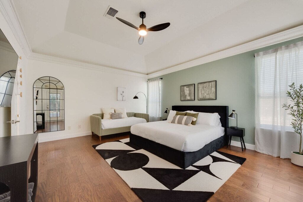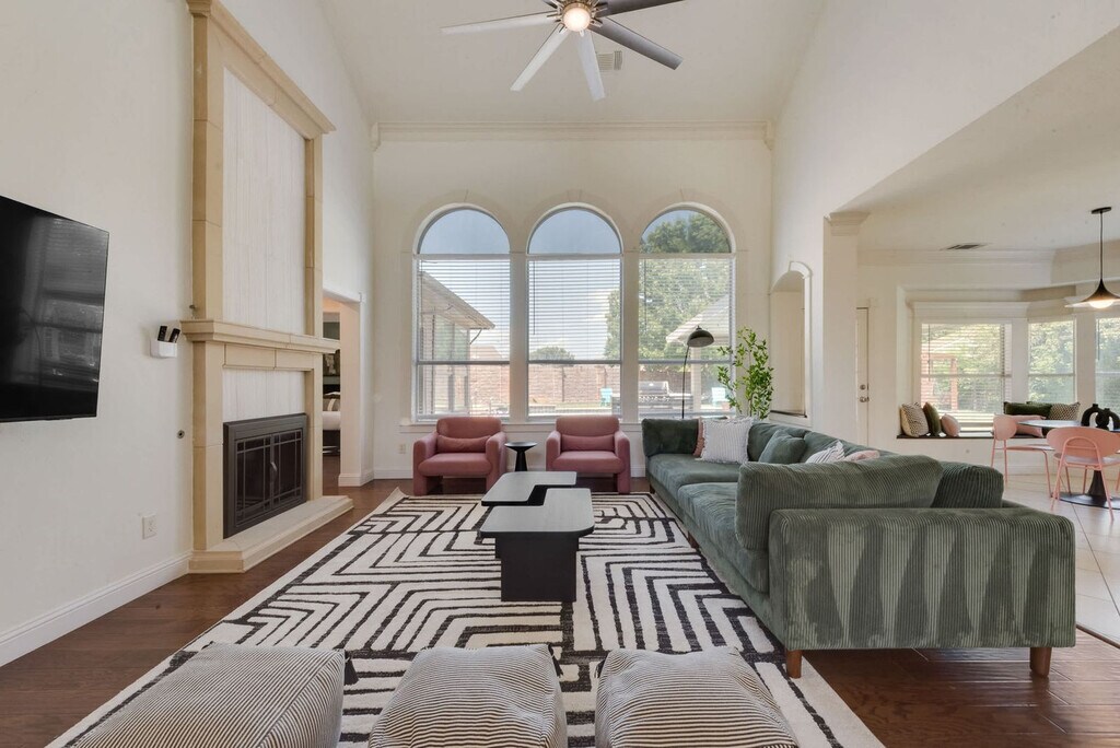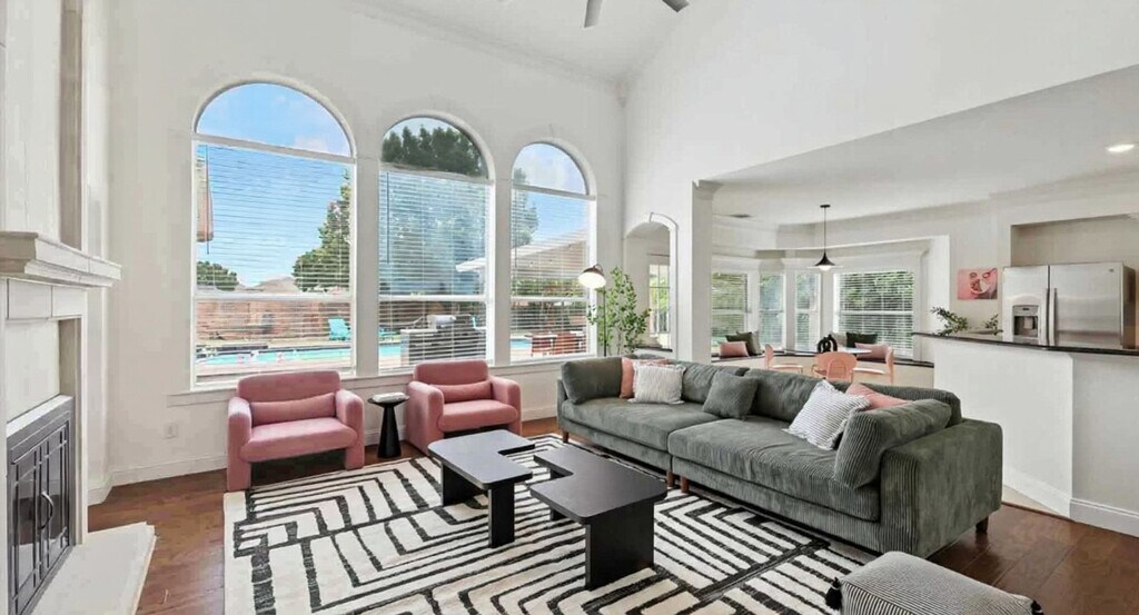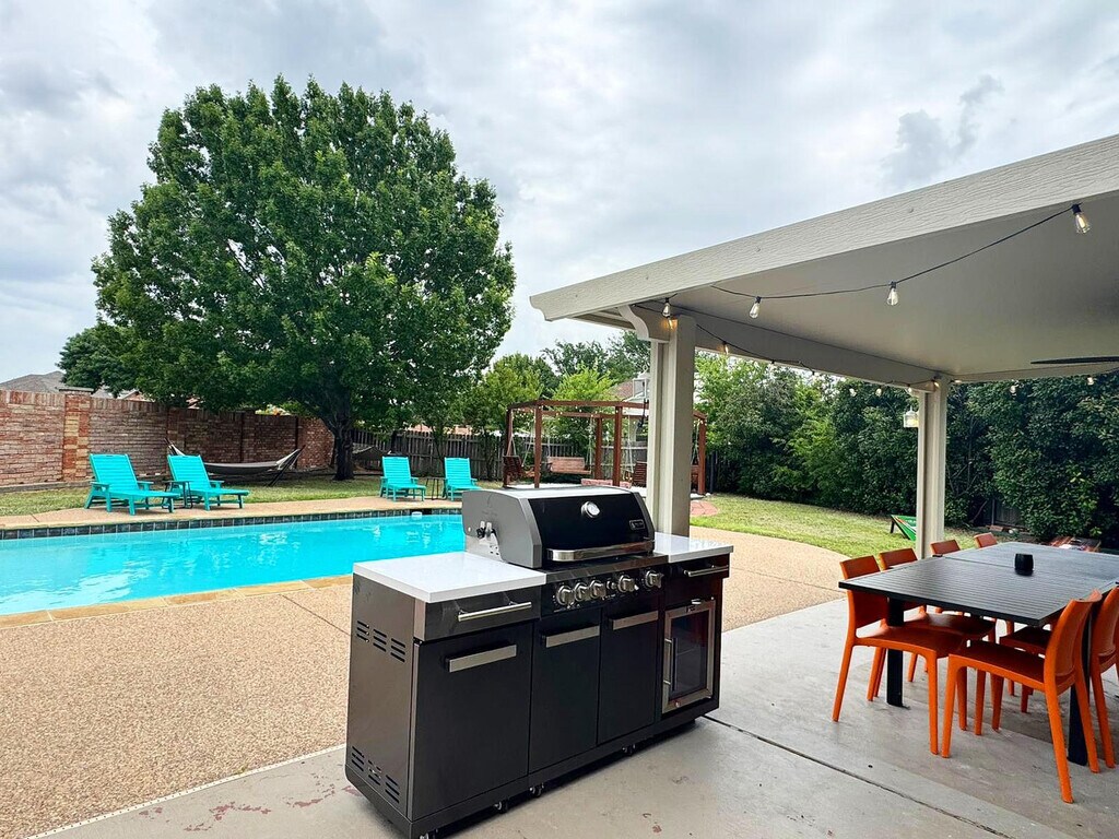 The advertised rate of $13,164/month is the lowest available price, based on a 1 month(s) stay with a move-in date of September 13, 2026. Rates vary depending on the duration of stay, season, and other parameters. For exact pricing and additional pricing components, please visit our website and enter your desired move-in and move-out dates. The rate is applicable when billed upfront; it can be higher if billed in multiple payments. Feel at home in this spacious 6-bedroom, 2.5-bathroom Fort Worth retreat, offering 3,200 sqft of comfort. The fully equipped kitchen features everything you need to cook and entertain, including pots, pans, silverware, utensils, and plates. Relax in the spacious living room with a 70” Smart TV, perfect for movie nights or game day. Enjoy a cinema room with a huge screen, arcade games, a basketball game, a popcorn cart, a magnetic dart board, and an oversized tumbling timber toy. The garage game room includes billiards, a dart board, a boxing machine, a golf mat, and a giant 4-in-a-Row. Additional amenities include high-speed Wi-Fi, central air conditioning and heating, a washer and dryer, and toddler-friendly accessories. House-trained pets are welcome for a fee of $150 per pet per stay. There is an additional nightly rate for 7+ guests: the nightly rate covers the first 6 guests, and for each guest beyond six, there is a $39 per guest per night additional fee. This quiet, residential neighborhood offers a peaceful retreat with spacious green areas and a family-friendly atmosphere. It's a great spot for relaxing while staying close to everything Haltom City has to offer. The home is well located, with a close drive to the Dallas Airport, located just 18 miles away. It is also only 19 miles from ATT Stadium and Six Flags, and 32 miles from Downtown Dallas. At just 23.4 miles away you can find the Hammons Convention Center and 22.6 miles away from Naval Air Station Joint Reserve Base Forth Worth Joint Reserve. Nearby attractions include Golf Club Fossil Creek (1.4 mi), Iron Horse Golf Course (2.2 mi), Billy Bob's Texas (5.6 mi), Stockyards Station (5.6 mi), Cowtown Coliseum (5.7 mi), Stockyards Rodeo (5.7 mi), Fort Worth Stockyards Historic District (5.3 mi), Sundance Square (7.3 mi), Fort Worth Convention Center (7.5 mi), Fort Worth Water Gardens (7.6 mi), West 7th Street (7.9 mi), and the Modern Art Museum of Fort Worth (8.5 mi). The fridge water dispenser is out of service. Quiet hours are between 10 p.m. and 9 a.m. Smoking indoors is strictly forbidden, and guests that break this house rule will receive a $500 penalty. Parties of any kind are not allowed on the property. Any violation of house rules may result in cancellation of the reservation without refund. The fourth bedroom will be opened for groups of 8+ guests to accommodate sleeping arrangements. Enjoy a private backyard with a pool, fire pit, cornhole, and a golf chipping target. The outdoor pool is professionally serviced twice a week in summer and once a week during the rest of the year. The pool and attached kiddie pool are not heated, and pool towels are not provided. The landscaper services the yard once a week. There are two exterior security cameras: one at the front door overlooking the yard, and one facing the driveway from the garage. These cameras record 24/7. There are no cameras inside the home. [SI]