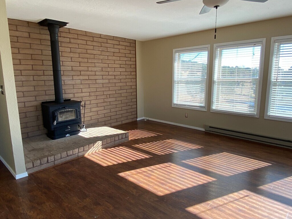 Comfy country home on 3 plus acres. Front entry leads to an open floor plan with large great room flooded with southern windows, a woodstove, and access to second story deck. Spacious kitchen with Corian countertop, ample cabinets, and new appliances is a chef’s delight. Dining room is large enough for a second living area. All with laminate flooring. Primary bedroom with walk in closet and full bath. Two other bedrooms and bath all with new carpeting. Large laundry room adjacent to bedrooms. Lower level has a multi-purpose room with half bath and closet. Oversized garage with workshop area. Fully perimeter fenced and cross fenced with pasture area and gates. Two stall pre-fab barn with hay storage and tack room. On community water, county roads, peaceful neighborhood. Easy access to Edgewood and Alb. Livestock requires a pet rent. Best to call Liz for phone interview, .
