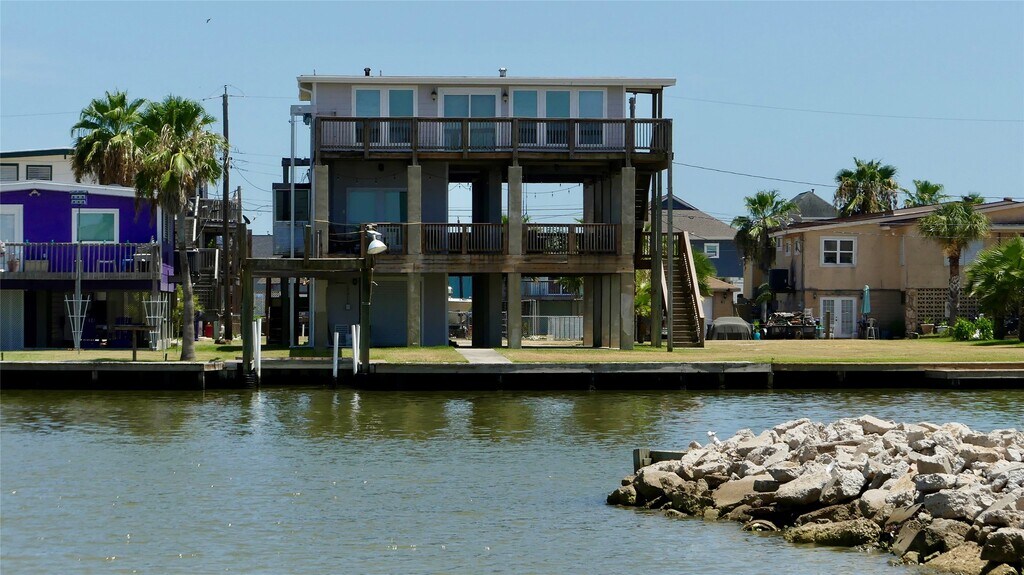 Perfect spot to relax and enjoy the water,great fishing and absolutely gorgeous views! Located in Bayou Vista subdivision with 100' frontage with a pier on the open water of Highland Bayou with direct access to Galveston Bay! Light and bright open concept with windows all across the front. Huge kitchen with lots of cabinets for storage,big island for cooking and seating. 2 bedrooms on main floor with 1.5 baths. 2nd level offers a wonderful deck for great outdoor living space. As well as another bedroom and bath with utility room. One car garage and carports with extra parking. This property is being leased fully furnished. Call today! MLS# 49203001