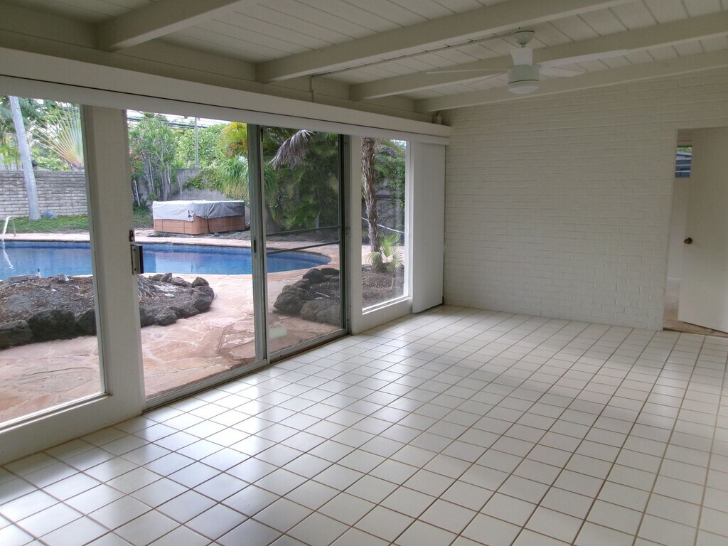 Older partly furnished 3 bedroom 2 bath home within a block of Kailua beach. Pool and spa. Walled yard for privacy. Pool service, yard service, solar water heater included. 2 car garage. Additional den and family rooms. Long term only. Initial lease for one year but prefer a party that intends to renew for additional years.