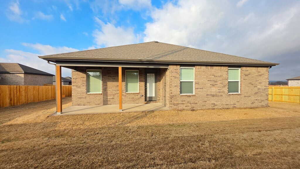 Welcome to your NEW HOME conveniently located in the heart of beautiful Prairie Grove! At nearly 2,100 sq. ft., this brand-new home features four spacious bedrooms and two full bathrooms, providing ample space for all your needs. The kitchen is a chef's dream, featuring quartz countertops and stylish cabinets. The luxury vinyl flooring throughout the main living areas adds elegance and durability. Each bedroom includes a large closet with ample storage. Step outside to your own covered patio and large fenced-in yard, perfect for enjoying the outdoors in any weather. All appliances are provided, including a washer and dryer. Experience the ideal blend of style, comfort, and convenience in this beautiful new home!
