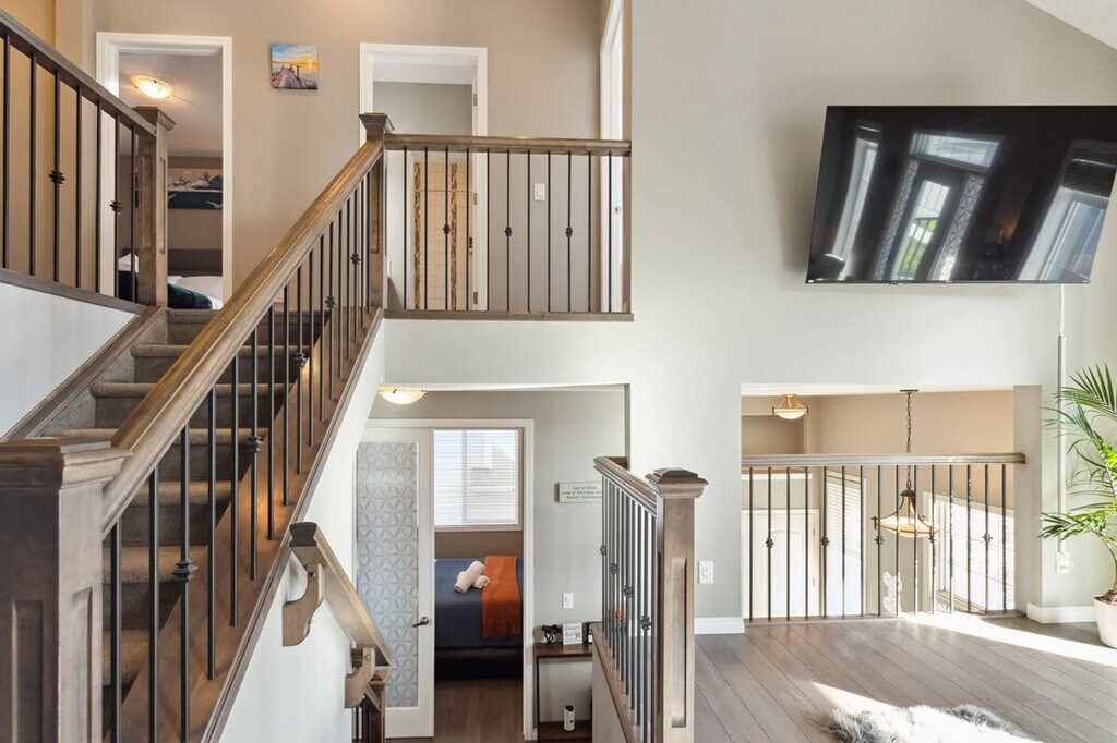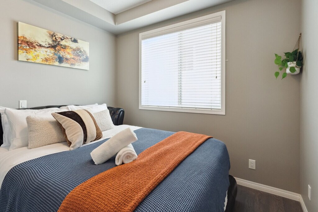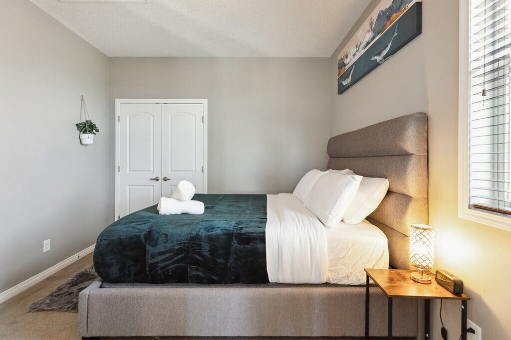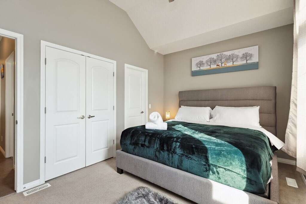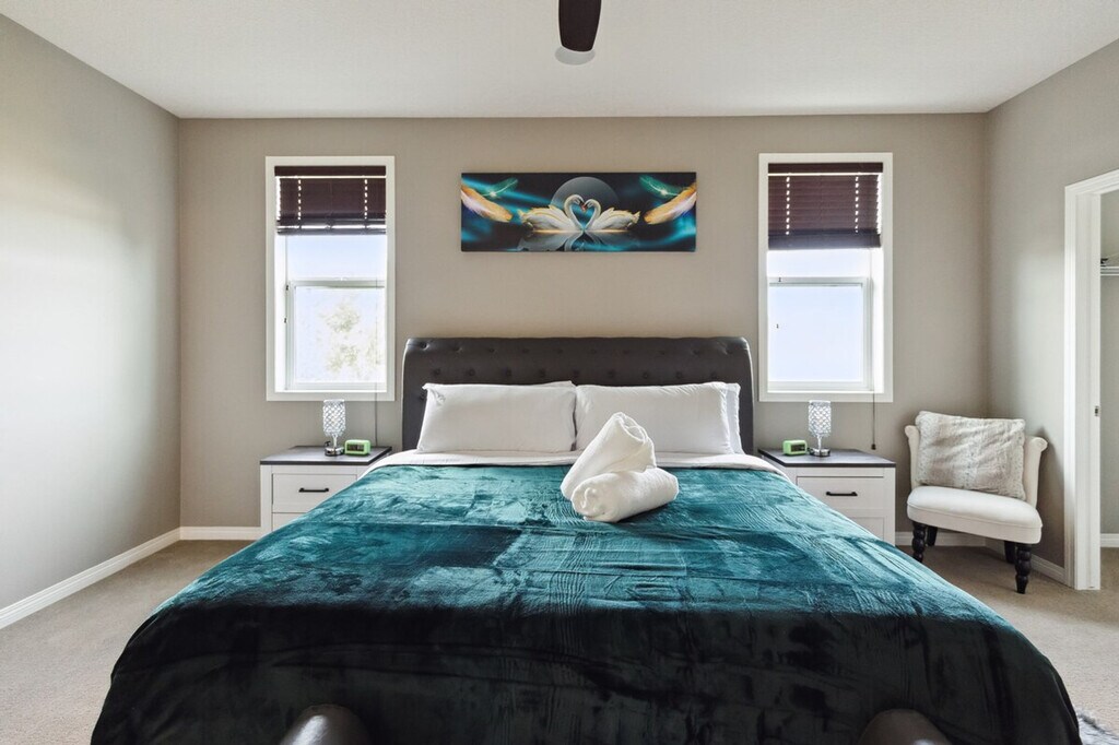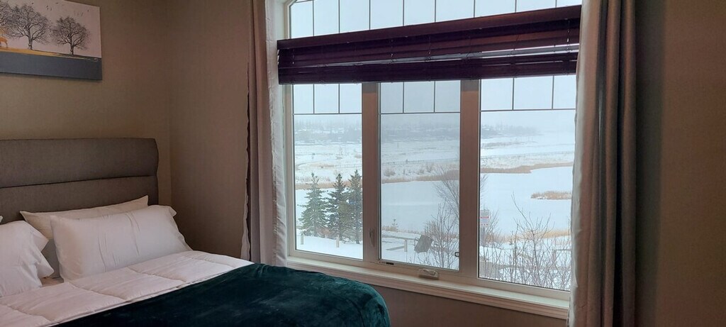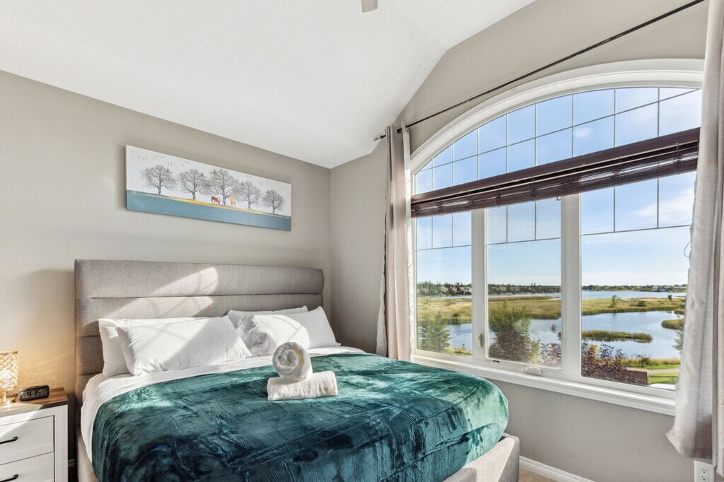 Welcome to your luxurious getaway, where lake views and upscale comfort await. This elegant retreat features king-size beds, lavish furnishings, and top-notch amenities for a regal experience. Whether visiting for the Calgary Stampede or a relaxing escape, this serene oasis offers the perfect mix of tranquility and convenience, just a short drive from the city. Explore the lake by kayak or enjoy vibrant local cuisine. The apartment provides a comfortable and elegant space to unwind after a day of adventure. Discover the local attractions with ease. Chestermere Lake, just 0.5 km east, is perfect for boating, fishing, and swimming. Anniversary Park, 1 km southeast, offers a sandy beach and picnic areas. Enjoy a round at Lakeside Golf Club, 2 km south, or visit the Chestermere Regional Community Association, 2.5 km southeast, for community events. John Peake Memorial Park, Sunset Beach, and Chestermere Bike Park are also nearby, offering various recreational activities. Calgary, Alberta, is a short drive away, providing access to Heritage Park Historical Village, Calgary Stampede, Calgary Tower, and more. While there is no central air conditioning in the apartment, open windows and ceiling fans keep the space comfortably cool.