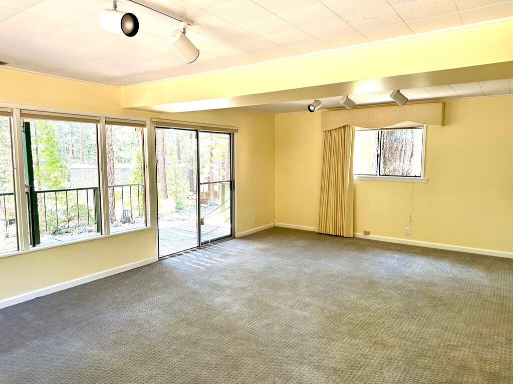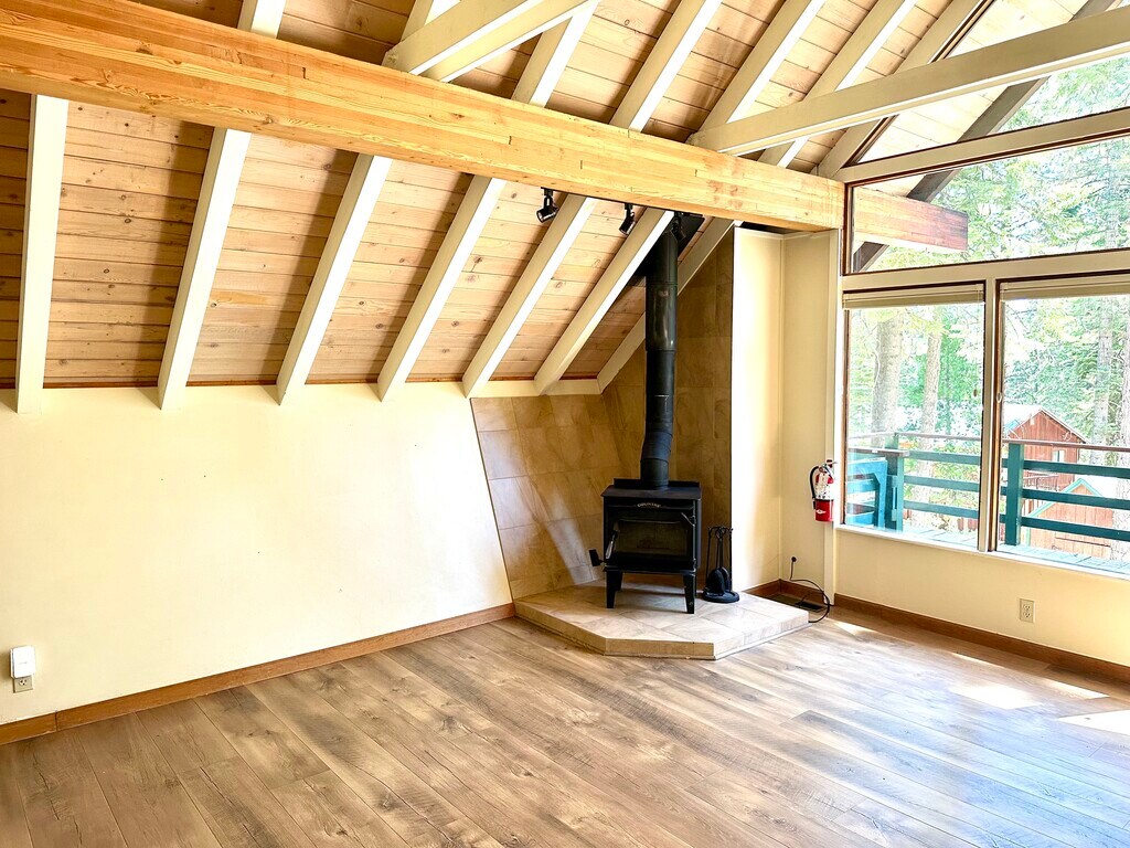 This 2 bedroom/2 bath cabin with loft offers over 2000 square feet of living space on three levels. The property has vaulted ceilings with floor to ceiling windows offering a bright feel and spacious living room with a woodstove. This main level also offers a bedroom, hall bath, large deck, and kitchen. Downstairs there is a very large bedroom with a sliding glass door going to a deck, a woodstove, bathroom, large walk-in closet, and laundry area. The upstairs loft area can be used as a bedroom or office. The property is centrally located between Kings Beach and Tahoe City, and has convenient access to Watermans Landing and the commercial core of Carnelian Bay.