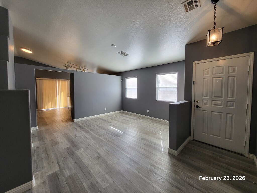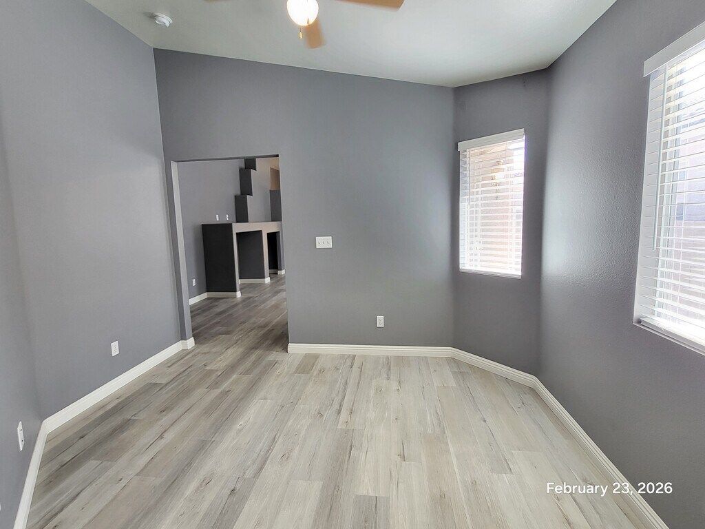 Beautifully updated single-story home featuring modern gray tones and upgraded vinyl plank flooring throughout! This bright and open floor plan offers a spacious living area with vaulted ceilings, neutral paint, and abundant natural light. The kitchen includes ample cabinetry, breakfast bar, and open dining space — perfect for everyday living. Generously sized bedrooms with ceiling fans and mirrored closet doors. Primary bathroom features dual sinks and a large shower enclosure. Low-maintenance desert landscaping in front for easy upkeep. Conveniently located near shopping, dining, and freeway access. Move-in ready and well maintained!