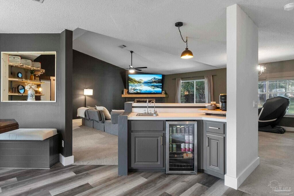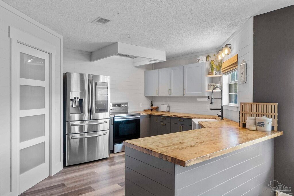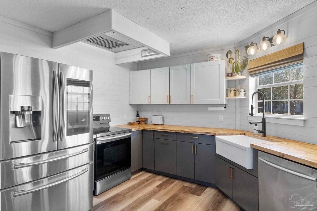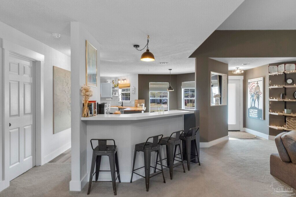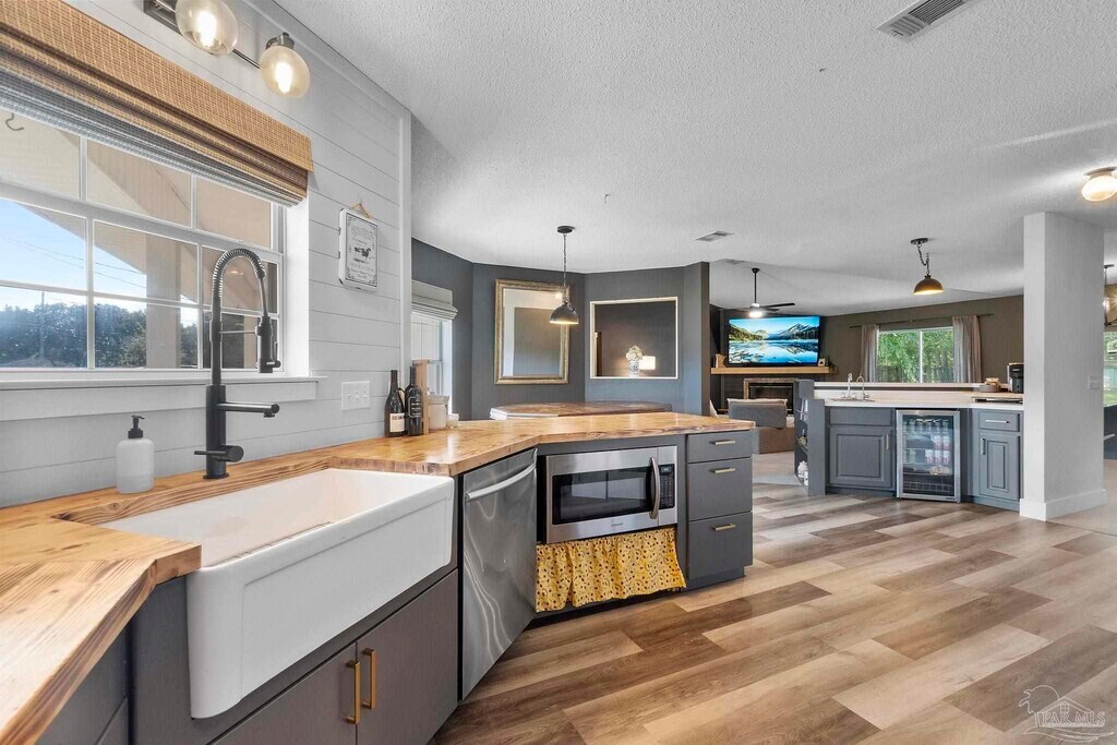 This updated home offers a spacious .68-acre lot paired with a thoughtfully designed open floor plan. The kitchen is a true standout,featuring a cozy breakfast nook with bench seating,a pantry,butcher block countertops,matching stainless steel appliances,and a wet bar complete with a mini fridge and filtered water dispenser. The great room is warm and inviting with its wood-burning fireplace and custom-built shelving. Throughout the home,you’ll find numerous custom touches,updated paint,modern fixtures,and upgraded flooring,all completed within the past few years. With a split floor plan,the sizeable bedrooms and ample closet space provide both comfort and privacy. The primary suite is a retreat of its own,boasting a large walk-in closet,double vanity,a soaking tub,and a tiled shower with multiple shower heads. Additional highlights include a two-car garage,a laundry room with a stackable washer and dryer,and storage shelving,a large open patio perfect for entertaining,and a yard building for extra storage. Located just minutes from Pensacola State College,restaurants,shopping,and easy interstate access,this property combines convenience with charm.