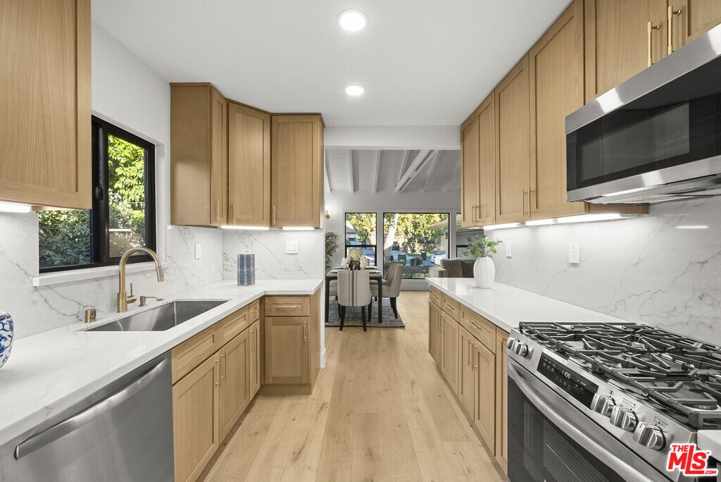 This classic Mellenthin Ranch home has been thoughtfully reimagined to reflect today's tastes while preserving its signature warmth and character including the iconic birdhouse perched atop the garage. Set on a quiet, curved street of equally charming homes in the bucolic Valley Glen neighborhood, the property is just moments from the Orange Line, adjacent bike paths, and Los Angeles Valley College. Lush, verdant landscaping surrounds the home, with expansive front and rear lawns shaded by mature trees and generous patio areas perfect for entertaining or simply relaxing. The light-filled interior features beautiful wood floors, striking designer fixtures & finishes, and a vaulted ceiling in the living and dining areas. The sparkling new kitchen offers abundant cabinetry and a charming Dutch back door that opens to the yard, while the elegant bathrooms are thoughtfully appointed and include bidets. Additional highlights include new HVAC with a Nest thermostat, new windows with custom high-end window coverings throughout, and a spacious two-car garage. This home captures the best of California living and feels like home. MLS# 26646493