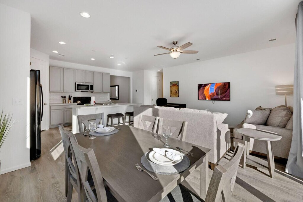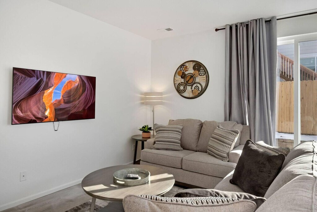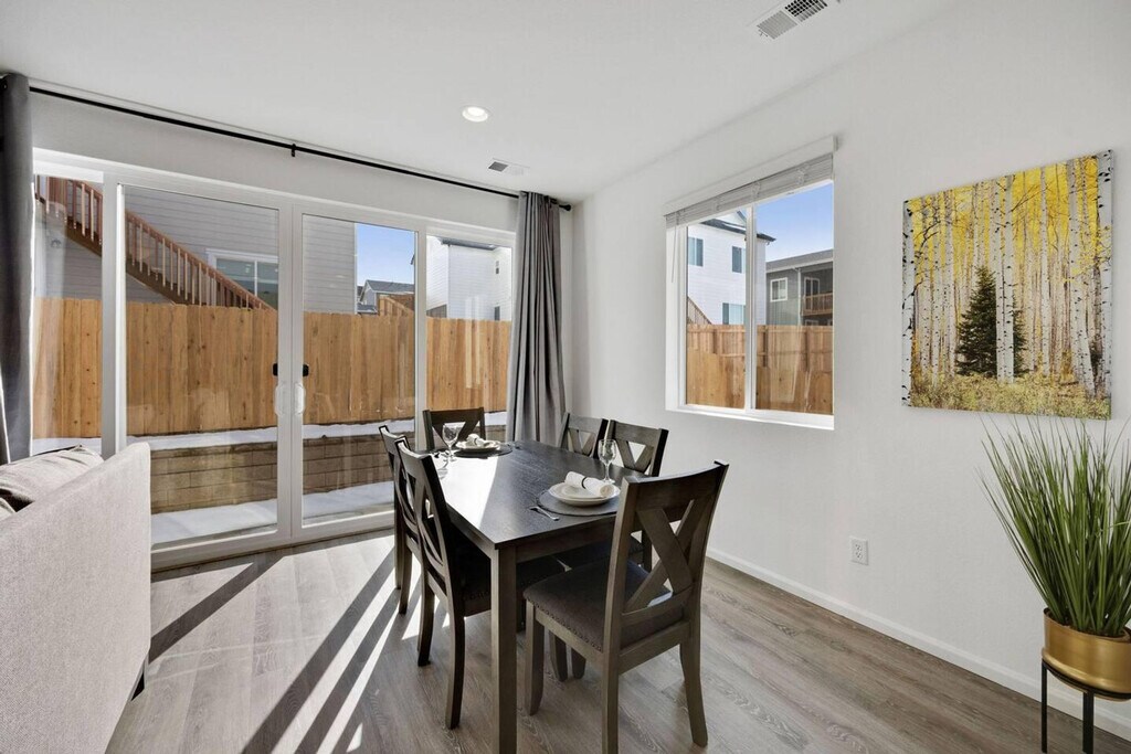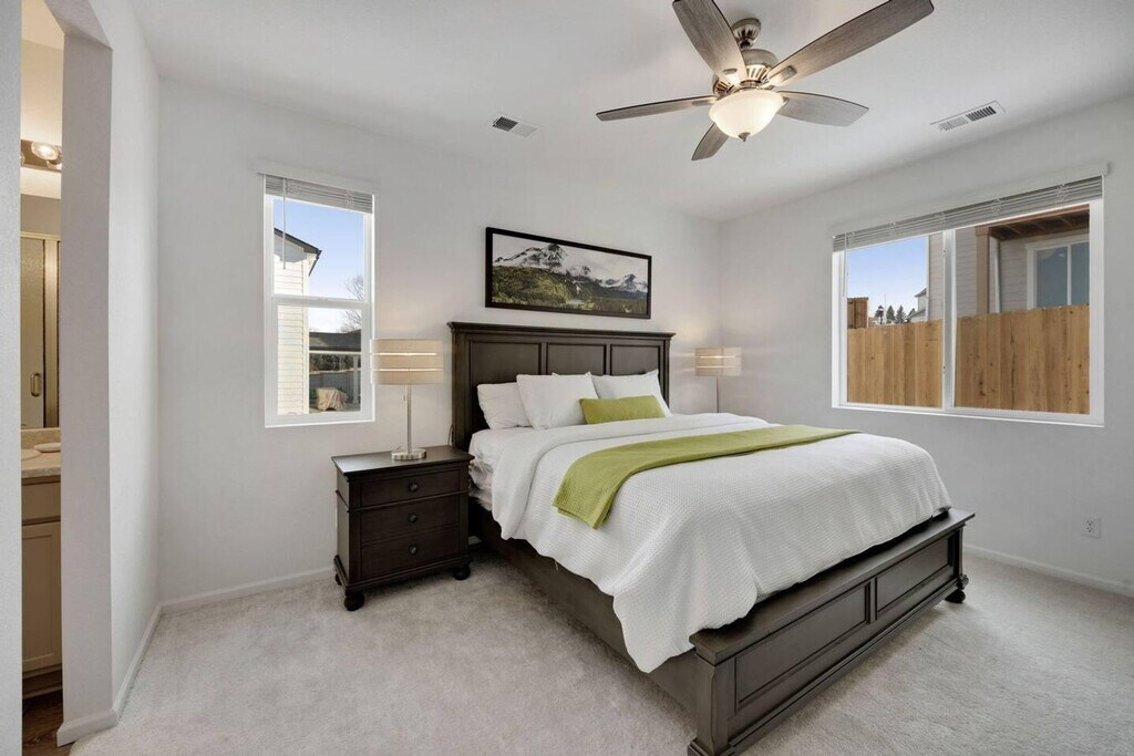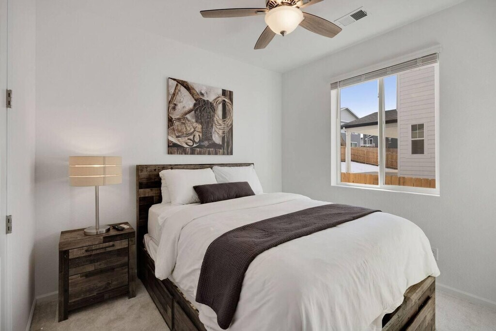 Welcome home to Windsor Villages at Ptarmigan, a gateway to Windsor, CO, featuring a 3-bedroom, 2-bathroom ranch-style home on the prestigious Jack Nicklaus designed golf course at Ptarmigan Country Club. This home offers a primary bedroom with a king-size bed and a large bathroom with a walk-in shower. The secondary bedrooms each have a queen-size bed and share a hall bathroom. The open and light-filled floor plan includes a living space with a desk area for work and ample seating in the kitchen and dining areas, perfect for entertaining. This home is equipped with high-speed internet and streaming services, ensuring you always stay connected and entertained. The kitchen is well-appointed, perfect for hosting dinners or casual meals. For added convenience, this home includes an attached 2-car garage with additional parking available via the driveway and street. Fido is welcome to enjoy the fully fenced backyard, though unfortunately, cats are not allowed at this time. Located in the notable Poudre School District, this charming ranch-style home is just a short drive from Loveland and Fort Collins. Residents will appreciate easy access to I-25, nearby golfing, shopping, and dining options, as well as concerts and sporting events at the Ranch Events Complex. The landscaping for this property will be completed by spring 2023. Please be aware that while a starter welcome packet is provided, any supplies beyond this are up to the guest to replenish as we do not restock these items. This is an industry-standard practice. Cleaning supplies are not stocked due to safety issues. The living space includes a desk area, ideal for those who need to work from home, ensuring productivity in a comfortable environment. [SI]