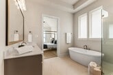 Absolutely Gorgeous New Custom Home in Frisco ISD. This brand-new custom home sits on a premium 85 x 115 ft corner lot, backing to a greenbelt and facing north. The open-concept floor plan features blonde wood flooring throughout the first floor, with the primary suite, guest suite, study, and media room all on the main level. Exterior upgrades include white brick with black window frames and a dark roof. Inside, the home showcases luxury finishes: quartz waterfall island, floor-to-ceiling cabinetry, designer pendant lighting, gold hardware, custom wallpaper, upgraded plumbing fixtures, and $$$ tile and quartz throughout. Additional highlights include modern accent walls, soaring ceilings, wood stairs with iron balusters, shaker-style doors, and gigabit ethernet wiring. The primary retreat offers cathedral ceilings, walls of windows, a freestanding tub, dual vanities, a seamless glass shower, and a spacious walk-in closet. Upstairs, you’ll find two en-suite bedrooms and a large game room. The oversized 2.5-car garage includes epoxy flooring and wiring for cameras and surround sound. Model-home-quality finishes in every detail.