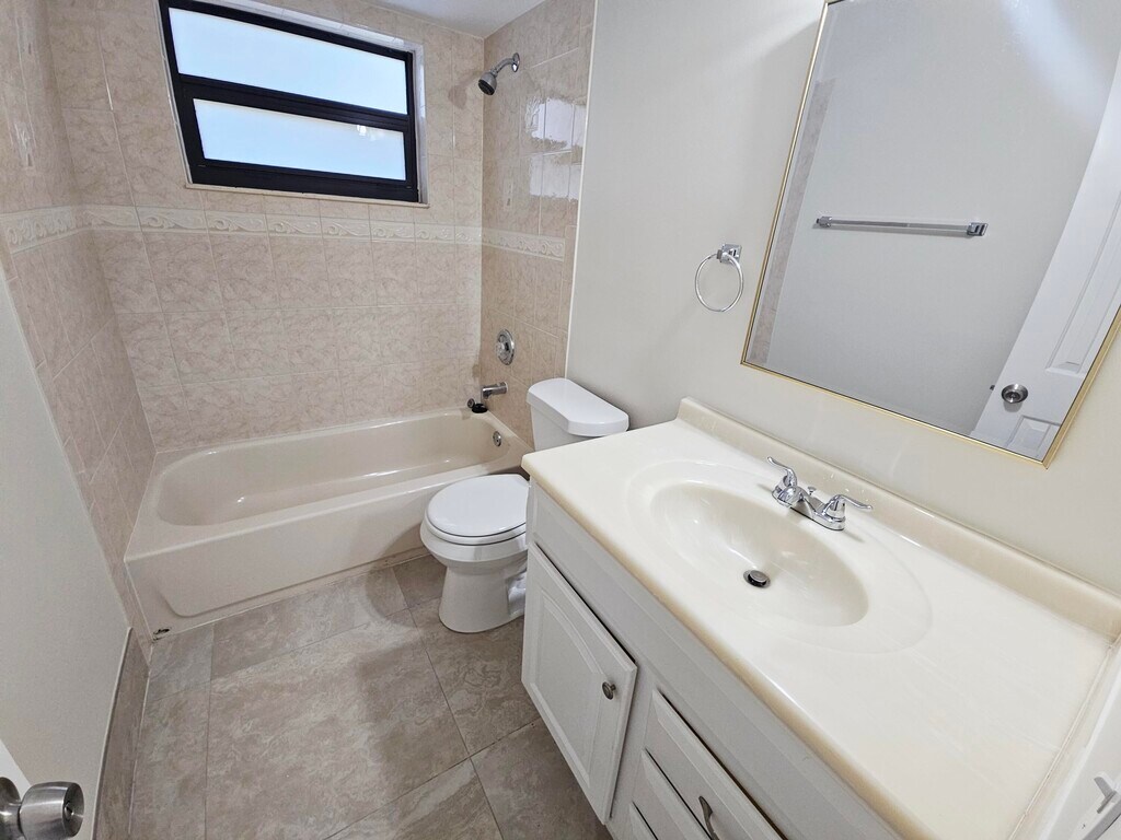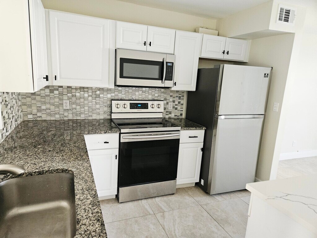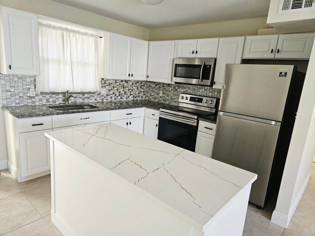 Private corner unit with screened in patio. Renovated 2/2 located on the 1st Floor, bright and spacious condo with an open-concept layout and tile flooring throughout . The kitchen has stainless steel appliances and a kitchen island. Enjoy peace of mind with impact windows throughout; full size washer and dryer. Cable and water included in the HOA fee. 15 days approval