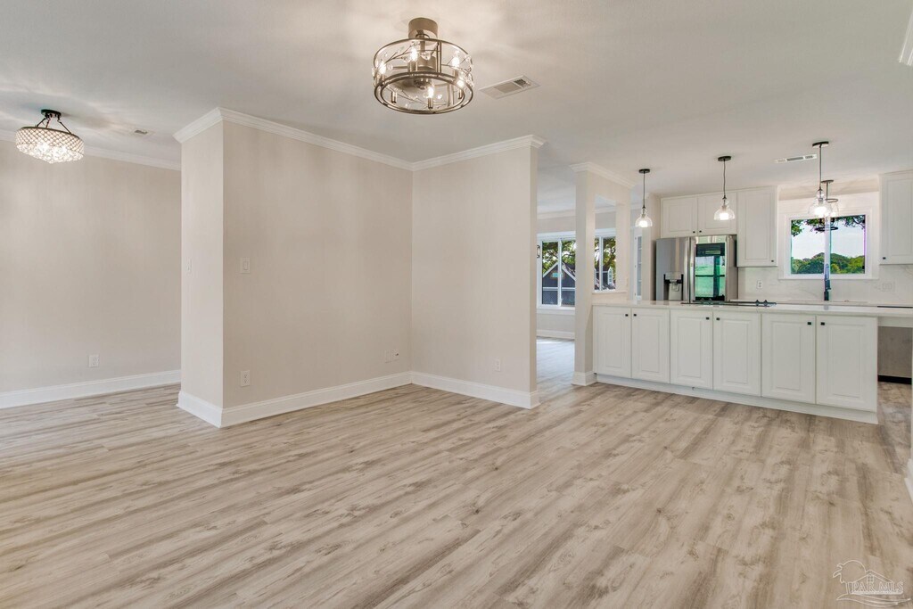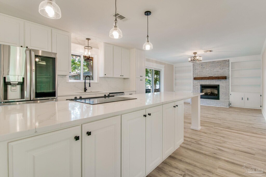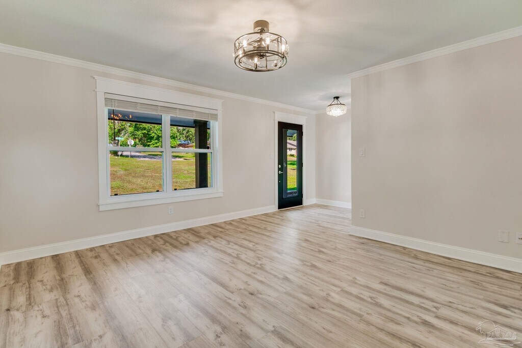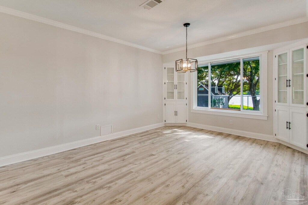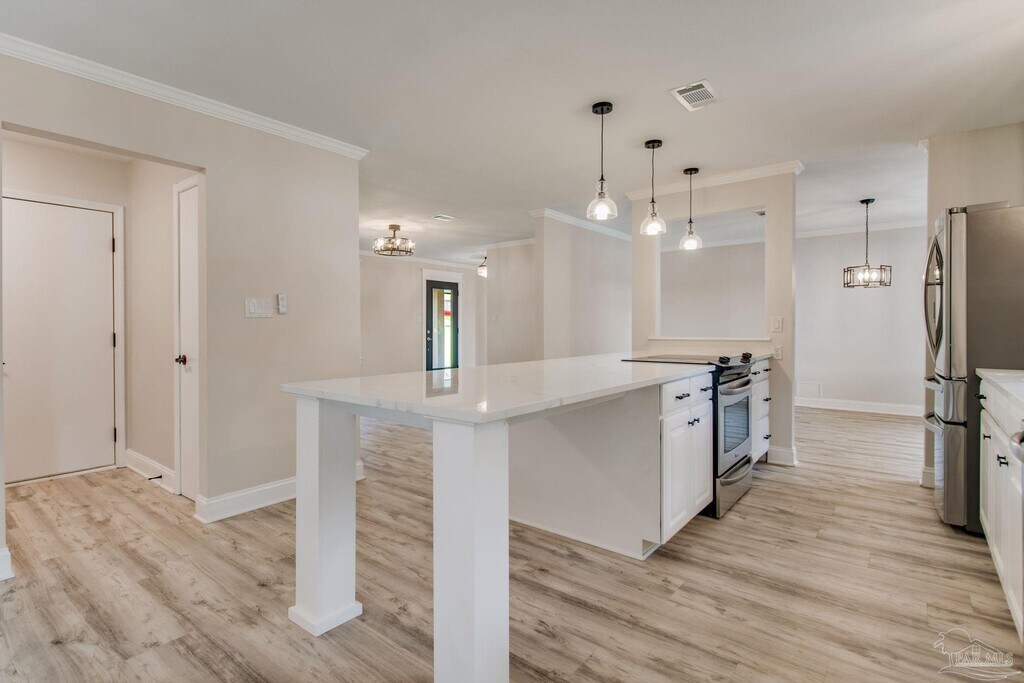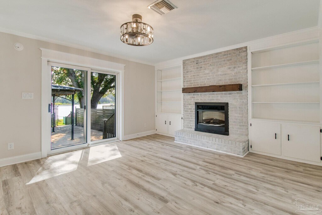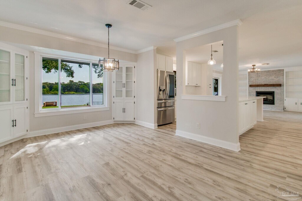Beautifully updated lakefront home! Fun “Fancy” Flamingo mailbox welcomes your family to a spacious,newly renovated 3BR,2BA family home with amazing views of Crescent Lake! Enjoy kayaking,paddle boarding & drop your fishing lines into lake from the dock with built in benches! A top of the line metal sea wall was built along the shoreline for conservation against erosion caused by water. Renovations & money saving utilities added – new gas lines were run to the home & tankless water heater was installed (saves on water & electric bills). A “She Shed,” 12X20 has been built to store all your outdoor toys or overflow storage. The outdoor pool has new privacy fencing and a 10X12 gazebo to enjoy your morning coffee or quiet evening. The interior has had a rather dramatic facelift. Updated lighting throughout the & Luxury Vinyl Plank (LVP) flooring. When the family comes in from 2 car garage with the new hurricane coded garage door step up into new mudroom & enter a spacious open-air kitchen with 10 ft quartz island with stainless steel appliances,push button garbage disposal and matching quartz backsplash; family room with built-in bookcases with centered fireplace; dining room with chandelier and 2 built-in china cabinets. From all these rooms,including MBR you have pool & lakeside views!!! Main ensuite has a walk-in closet,shower with bench & sliding doors leading out to pool. Hallway has an oversized closet for linens,towels & storage with sliding glass doors. From the hallway the 2nd bathroom has tile work leading up to ceiling with glass shower doors. The bedrooms are large enough to put in bunk beds or up to queen size beds; closets have sliding glass doors and ceiling lights with fans. This home is nicely located with nearby shopping,downtown,beaches,new Baptist Hospital & Navy base. You are in the center of everything & you’ll fall in love with this waterfront home! Pool & lawn maintenance included in rent. Small dog considered with owner approval.