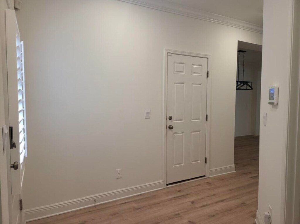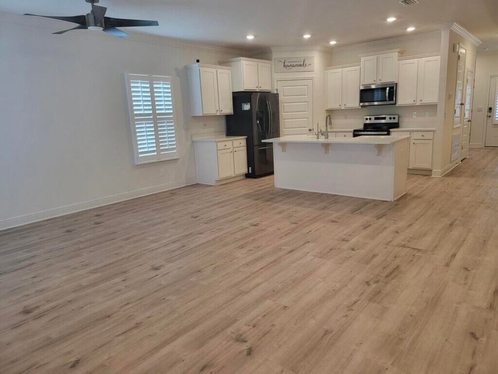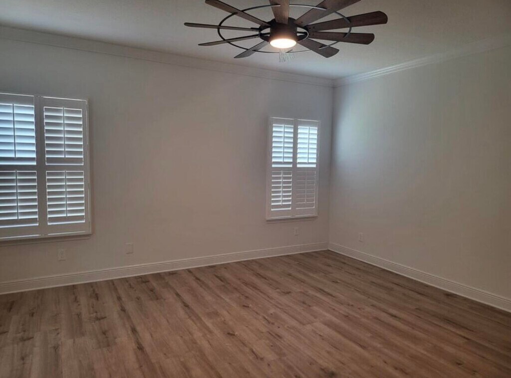 This 5 bed, 3 bath floorplan is located in Waltons Landing. Community pool and dog area. New plantation shutters and fully fenced back yard with water view. Features include 9' ceilings, EVP flooring throughout, stainless appliances including a refrigerator, stove, microwave, dishwasher.Home is agent owned.