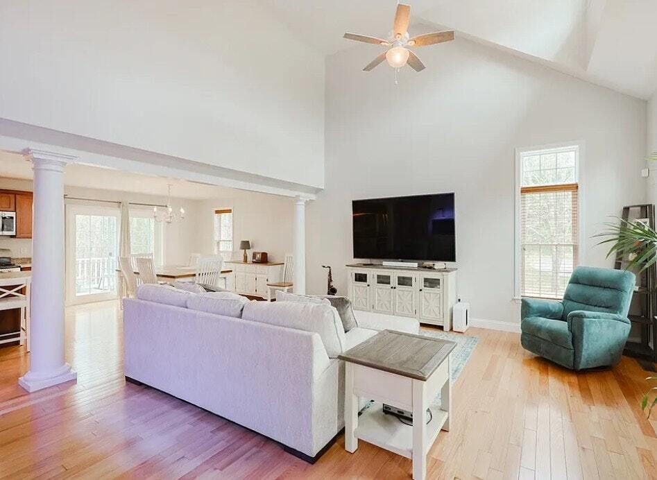 Beautiful 3-bedroom, 2.5-bath modern gem, perfectly blending style and functionality. The open floor plan showcases a soaring cathedral ceiling in the living room, complemented by gleaming hardwood floors throughout. The first-floor master suite offers convenience with a spacious walk-in closet, alongside a well-placed laundry room. Both full bathrooms feature elegant double vanities, with an additional half bath for guests. The kitchen dazzles with stainless steel appliances and a large eat-in island, seamlessly flowing into the adjacent dining room. Entertain effortlessly with a front porch for morning coffee, a sliding glass door opening to a back deck, and a patio with a cozy fire pit. The large, beautifully landscaped backyard, complete with an irrigation system, is perfect for relaxation or play. The attached 2-car garage provides ample storage. The unfinished basement, with high ceilings and full-size windows, is ready for finishing for additional living space.