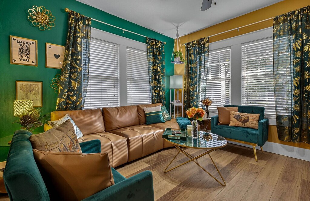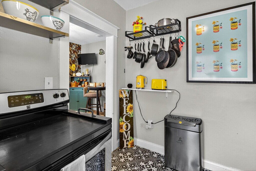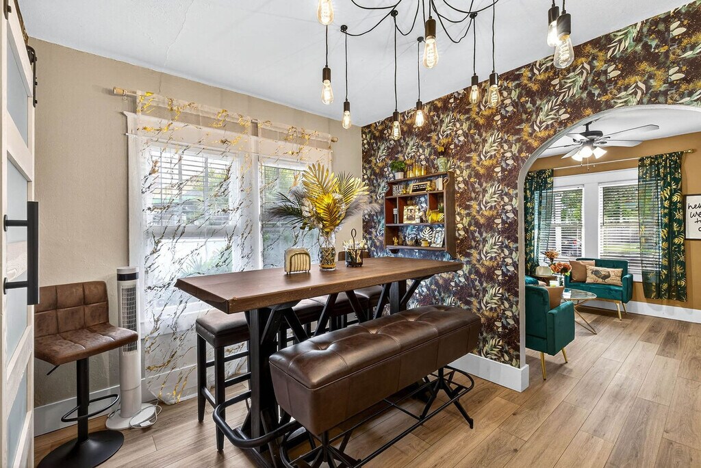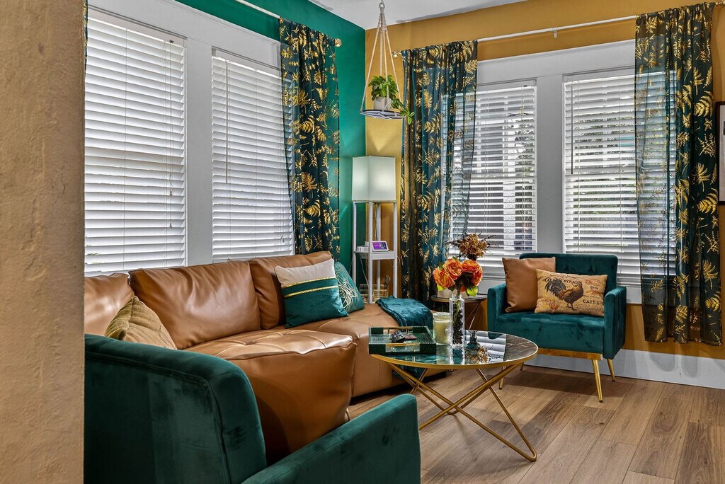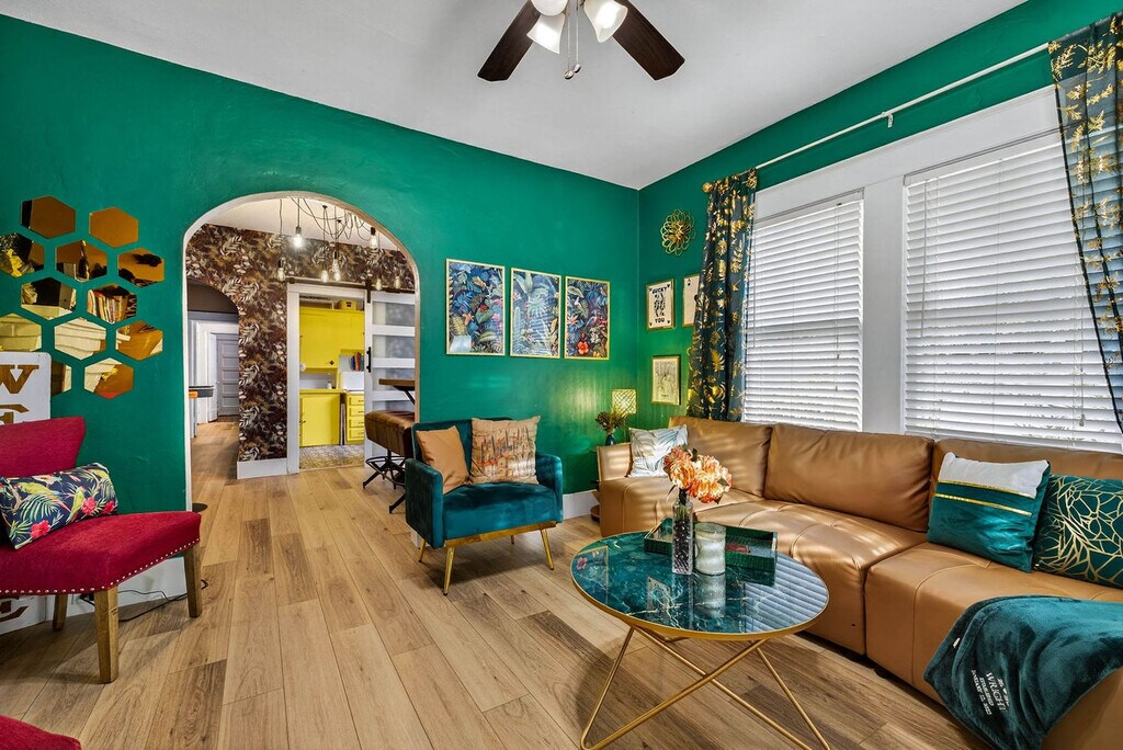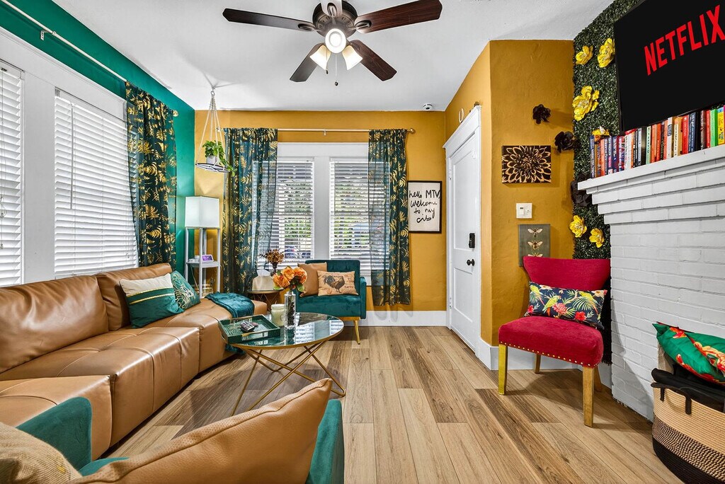 Casa de Cashmere is a one-of-a-kind 1-bedroom apartment that blends Ybor City-inspired charm with boutique comfort. Think bold colors, curated décor, and a story woven through every detail. Perfect for solo travelers, couples, or remote workers looking for something more soulful than a standard rental. Sleeps 2 comfortably. Eclectic design with a nod to Tampa’s history, cozy living areas, full kitchen, and our no-chores-at-checkout promise! Welcome to Casa de Cashmere, a vibrant, thoughtfully styled 1-bedroom, 1-bath apartment designed for travelers who appreciate personality and comfort in equal measure. The bedroom features a queen bed with soft linens, leafy hanging planters, a white brick accent wall, and blackout shades for restful sleep. The living areas include a cozy sofa, Smart TV, reading nook, bold green accent walls, eclectic art pieces, and playful nods to Ybor City’s famous free-roaming roosters. The kitchen is fully equipped with a full-size oven, stovetop, coffee maker, toaster, and everything you need to cook at home, with bright yellow cabinets adding a sunny, cheerful vibe. The dining nook is an intimate space for two, perfect for meals, morning coffee, or a late-night glass of wine. The bathroom is clean and classic with a tub/shower combo, sunflower accents, and all the essentials stocked for your stay. An in-unit washer and dryer are available for your convenience during extended stays. Casa de Cashmere is cozy yet vibrant, a unique home that feels distinctly “Tampa.” Pets are allowed in this unit with a fee. Exterior cameras on-site for safety and insurance compliance. Located in historic Seminole Heights, this home puts you close to Tampa’s most beloved local spots, coffee shops, craft breweries, vintage boutiques, and riverside parks. Just minutes from downtown, Armature Works, and Ybor City. With quick access to I-275, you’re close to everything Tampa Bay has to offer: Downtown Tampa – 10 mins, Armature Works & Riverwalk – 8 mins, Ybor City – 10 mins, Busch Gardens – 15 mins, Tampa International Airport – 18 mins, Clearwater Beach – ~40 mins. Free off street parking available in our private driveway. Our trusted partner team is here to make your experience seamless and stress-free. We communicate through the booking platform but are happy to text or call if you need local recommendations or quick assistance during your stay. No need to clean before you leave, we’ve got it covered. [SI]
