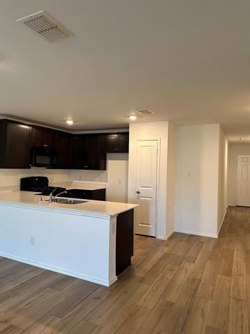 The highly coveted floor plan has an open concept kitchen with an island for storing cooking gadgets, plenty of modern light gray cabinetry and quartz counter top space with a light gray subway tile backsplash and coordinated gray, brown light Rigid Core Polymer plank flooring throughout the entire home. Plush stain resistant carpet in all bedrooms. The kitchen is open to the family room located near the breakfast nook and covered patio for entertaining or relaxing at home with family. Double vanity with quartz countertops in the owner's suite bath and enlarged shower with linen closet.