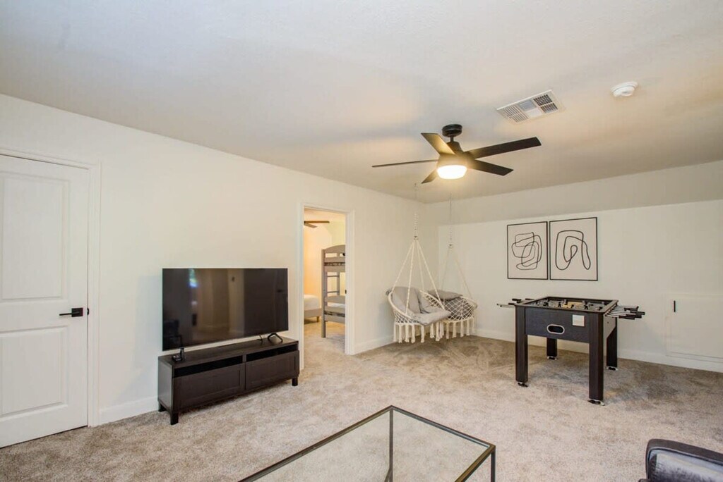 Feel at home in this amazing vacation home in the much-desired neighborhood of Westbury. This property features 4 beautifully furnished bedrooms and 3 spa-like bathrooms. This vacation home boasts a modern open-concept layout with a stunning white kitchen and a dreamy backyard oasis. The fully equipped chef’s kitchen includes stainless steel appliances such as a fridge, freezer, stove, oven, dishwasher, and microwave, along with all basic cooking essentials, a kitchen island, and a breakfast bar with quartz countertops. There is a dining table with seating for 8, a breakfast bar with stool seating for 3, and a cozy breakfast nook. The main level living room has two couches, a designer rug, and a coffee table, while the upstairs living room features a couch, hanging chairs, a coffee table, and a foosball table. Enjoy flat-screen TVs, high-speed Wi-Fi, and aesthetic touches such as artwork and plants. The backyard offers an outdoor swimming pool, a hot tub, a brand-new deck, an outdoor grill, patio furniture with lounges and a hammock, and a fully fenced yard for your privacy. A laundry room is fully equipped with a washer and dryer. House-trained pets are welcome with a non-refundable pet fee of $150 per pet (maximum of 2 pets per stay). Free parking is available. Houston is known for its tasty Tex-Mex and contributions to space and science. Nearby attractions include The Houston Museum of Natural Science (16-minute drive), Houston Zoo (15-minute drive), and Minute Maid Park (21-minute drive). Explore exciting neighborhoods such as Midtown, Washington Avenue, and Montrose for great restaurants, lively bars, and exciting times. Smoking of any type is not allowed and violations are subject to a $450 fine plus the cost to clean, deodorize, and repair damages. No parties or events are allowed. Check-in is at 4pm and check-out is at 10am. A noise alert device is installed in this home that does not record or store sound data, but only measures decibels and sends alerts in case reasonable noise levels are exceeded. The master bedroom includes a work station, and the third bedroom also includes a work station. Registration Number: STR-2025-000451 [SI]