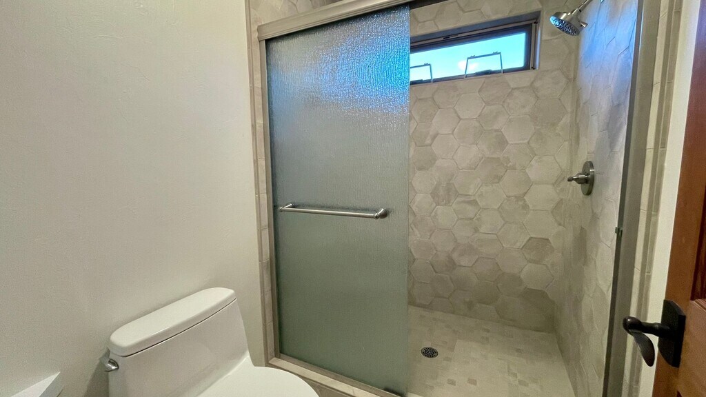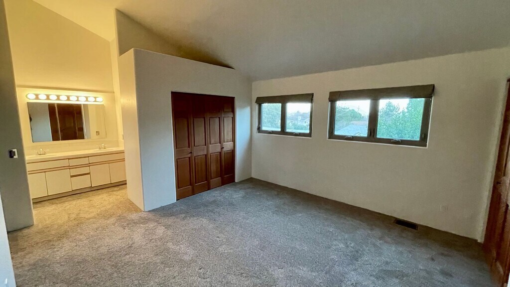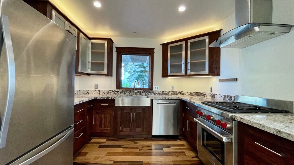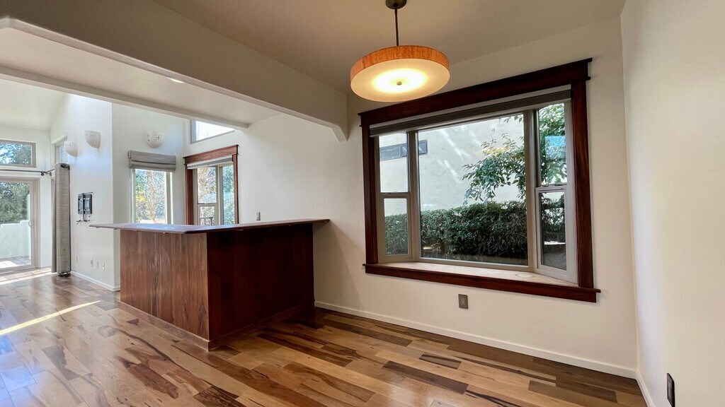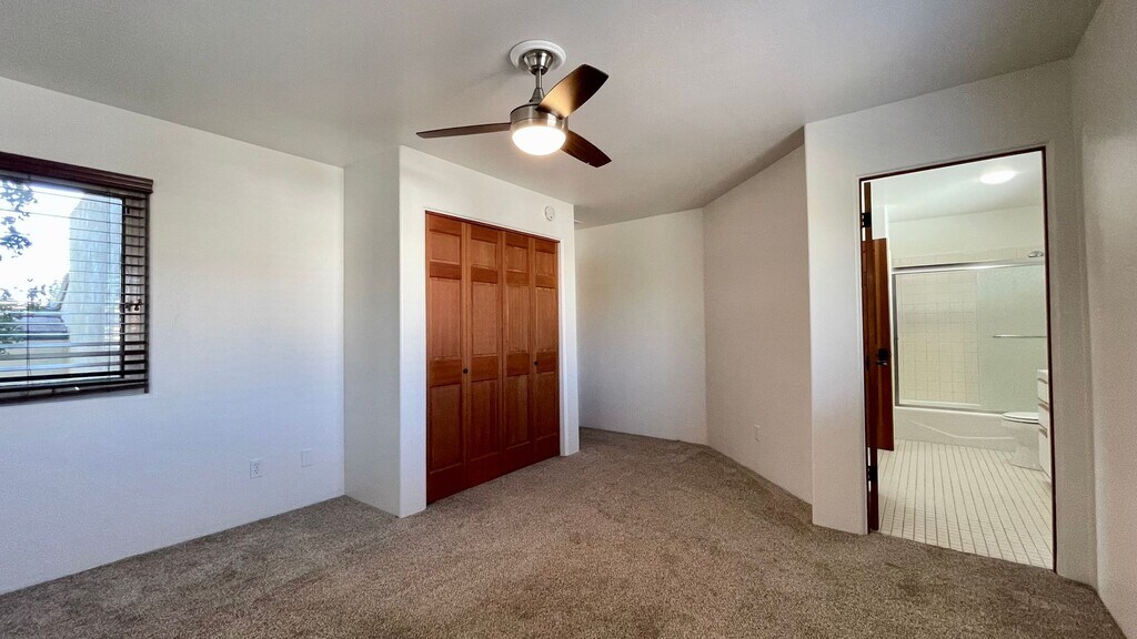 This 3-bedroom Stoneridge home has been extensively renovated with a modern aesthetic and includes air conditioning. There are hardwood floors throughout all the main living areas with carpet in the bedrooms. The kitchen has had a complete renovation with newer hardwood cabinets, granite countertops and a Wolf range. The living room features a built-in bar area with marble countertop and an impressive floor to ceiling fireplace. The skylights, bay windows and double sliding doors to the back deck flood the main living areas with natural light. The primary bedroom is on the main living area and offers 4 closets and a separate deck with a hot tub. The ensuite bathroom has a large walk-in shower with new tile. The two upstairs bedrooms share a jack-and-jill style bathroom and also include ample closet space with custom built-ins. The garage has a modern glass door, built in cabinet storage and a finished epoxy floor. Located in the desirable Stoneridge neighborhood adjacent to the South Hills with a park and hiking trails at the top of the street. Professionally managed by Link Real Estate Group, Inc. Lic#02180351
