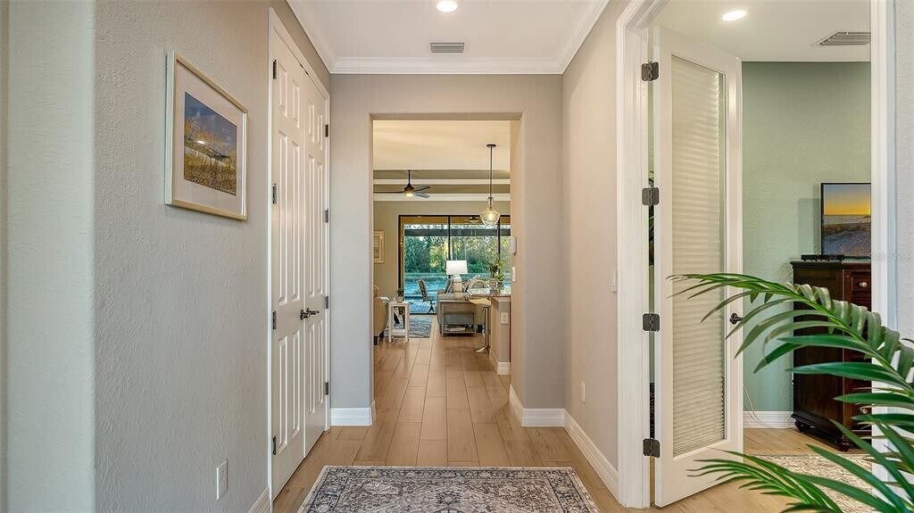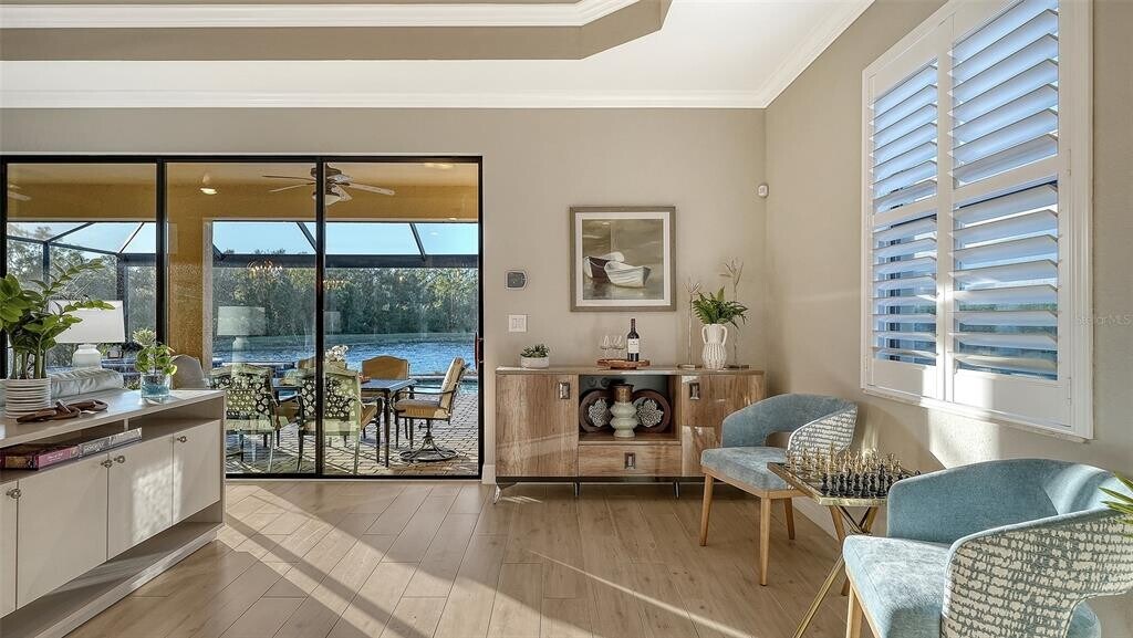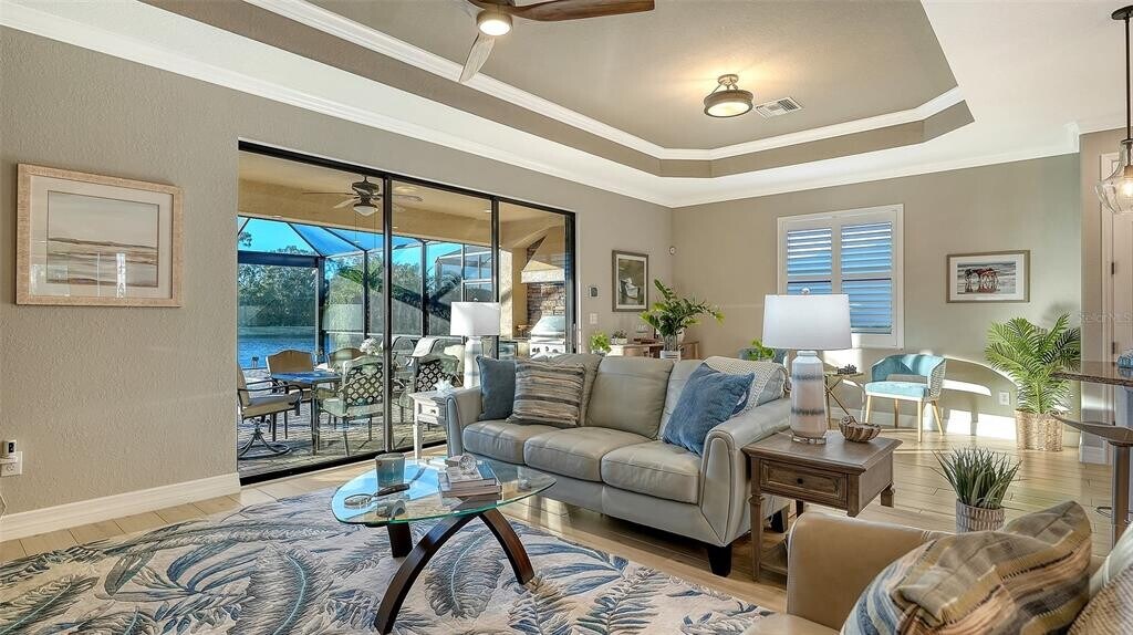 Beautiful two bedroom,two and a half bath (plus a den) single family home offers peace and tranquility with stunning views of the lake. Enjoy hassle free,Simple elegance in this beautiful,organic themed single family home located in the much sought after gated community of Lakewood National Golf Club,which boasts 2 champion golf courses and hosts the prestigious LECOM Annual PGA Suncoast Classic among other events. This beautiful home offers a stunning open floor plan,with unrivaled water views upon entering courtesy of your tropical pool/spa’s invisible picture screen. The spacious master suite is cleverly located at the back of the home to maximize the beautiful picturesque water views directly from bed and features double walk-in closets and ensuite bathroom,with welcoming soaking tub,double sinks and walk/in shower .The pool/spa area features an outdoor grill,TV and the latest technically advanced quiet heating system,as well as an outdoor half-bath. Elegant new custom lighting,central air system and other upgrades are featured throughout. Be our guest and enjoy the simple pleasures of Florida resort style living without the stress and worry in your own private oasis. Furniture can be removed as this home is offered unfurnished as well. ALL Clubhouse amenities transferable,Comes with an electronic vehicle gate pass. Golf cart can be rented for an additional fee,& Pool maintenance,lawn care and Organic pest control included. MLS# A4649707